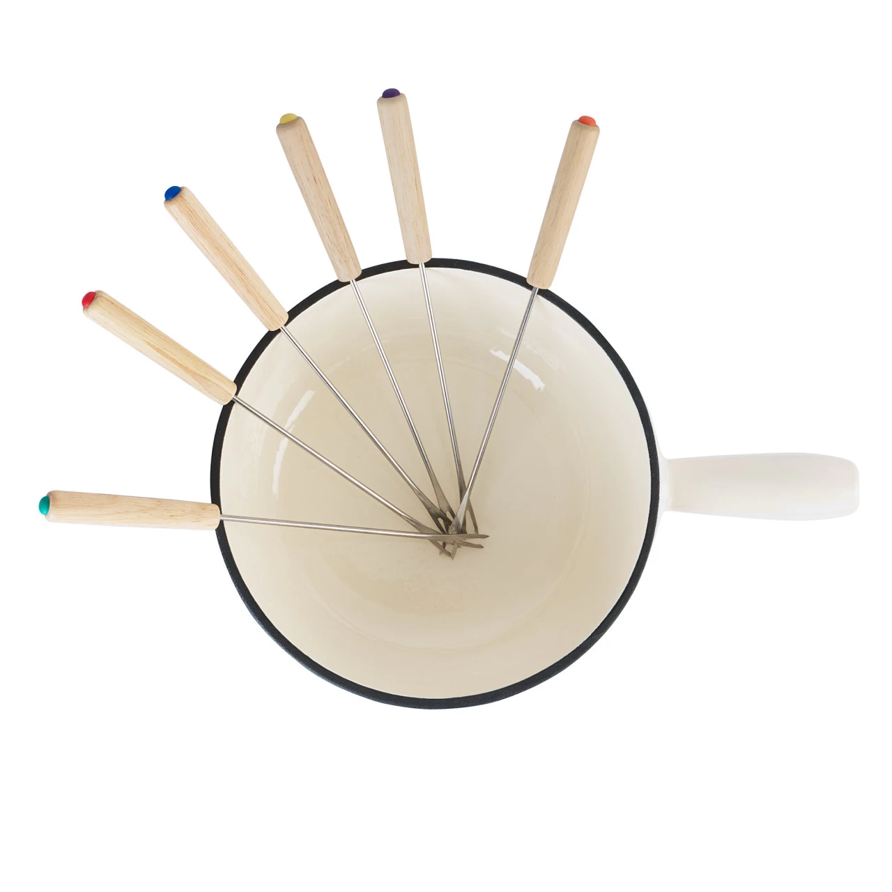 Die im Lieferumfang enthaltenen Fonduegabeln sind mit praktischen Holzgriffen ausgestattet, welche einen guten und sicheren Halt ermöglichen. Zusätzlich sind die Gabeln mit unterschiedlich farbigen Markierungen versehen, diese verhindern eine Verwechslung der Gabeln.