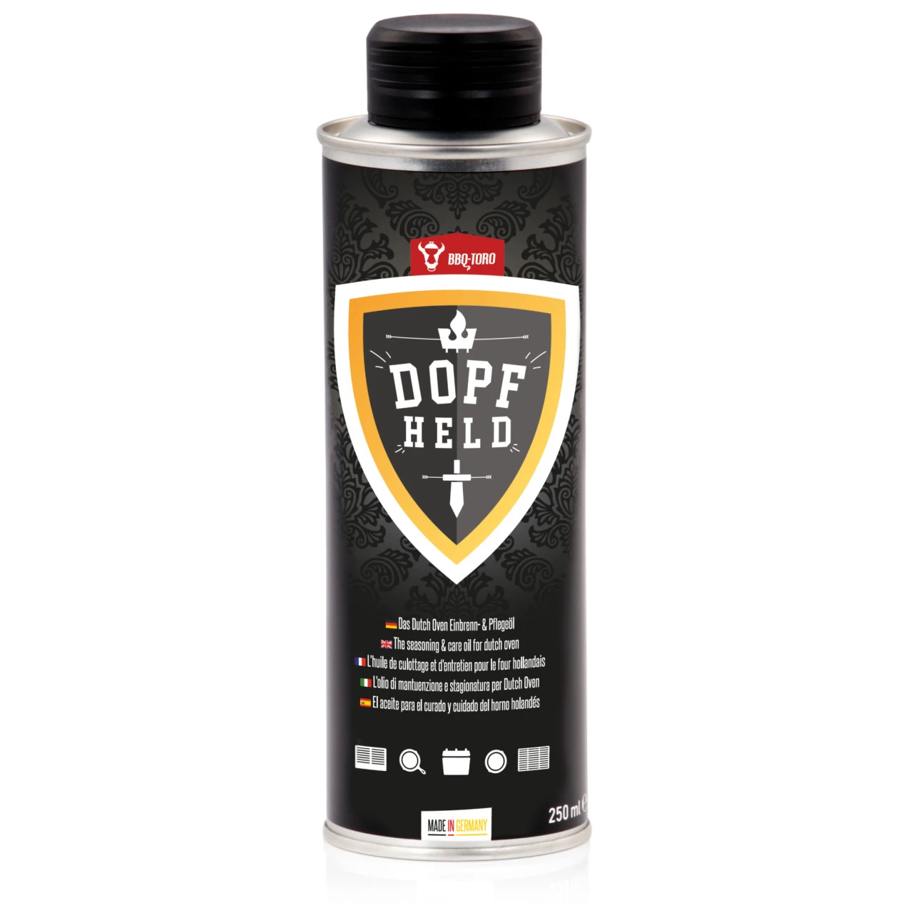 Das Einbrennöl „DOPFHELD“ ist „Made In Germany“ und pflegt Dutch Oven und weiteres gusseisernes Grillzubehör. Eine regelmäßige Anwendung des Öls bildet eine hochwertige Patina. Das Öl schützt vor Anhaften der Speisen und Rost. Das Öl beinhaltet ausschließlich natürliche Inhaltsstoffe, wie Mittelkettige Triglyceride und ist lebensmittelecht, geruchslos, geschmacksneutral, glutenfrei und vegan.