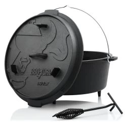 Der Dutch Oven ist ein schwerer, traditioneller, gusseiserner Topf und ein exakt passender Deckel mit dem man überall kochen, braten, schmoren, frittieren, dünsten und backen kann. Der Dutch Oven reguliert dank seiner hohen Masse (Gusseisen) ungleichmäßige Hitze und ermöglicht so ein gleichmäßiges Garen. Einfach glühende Kohlen, Glut oder Grillbriketts auf den Deckel und unter den Topf geben und das Dutch Oven-Erlebnis kann losgehen. Der extra erhöhte Deckelrand und die drei Beine bieten optimale Bedingungen für Kohle und Co.