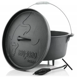 Der Dutch Oven ist ein schwerer, traditioneller, gusseiserner Topf und ein exakt passender Deckel mit dem man überall kochen, braten, schmoren, frittieren, dünsten und backen kann. Der Dutch Oven reguliert dank seiner hohen Masse (Gusseisen) ungleichmäßige Hitze und ermöglicht so ein gleichmäßiges Garen. Einfach glühende Kohlen, Glut oder Grillbriketts auf den Deckel und unter den Topf geben und das Dutch Oven-Erlebnis kann losgehen. Der extra erhöhte Deckelrand bietet optimale Bedingungen für Kohle und Co.
