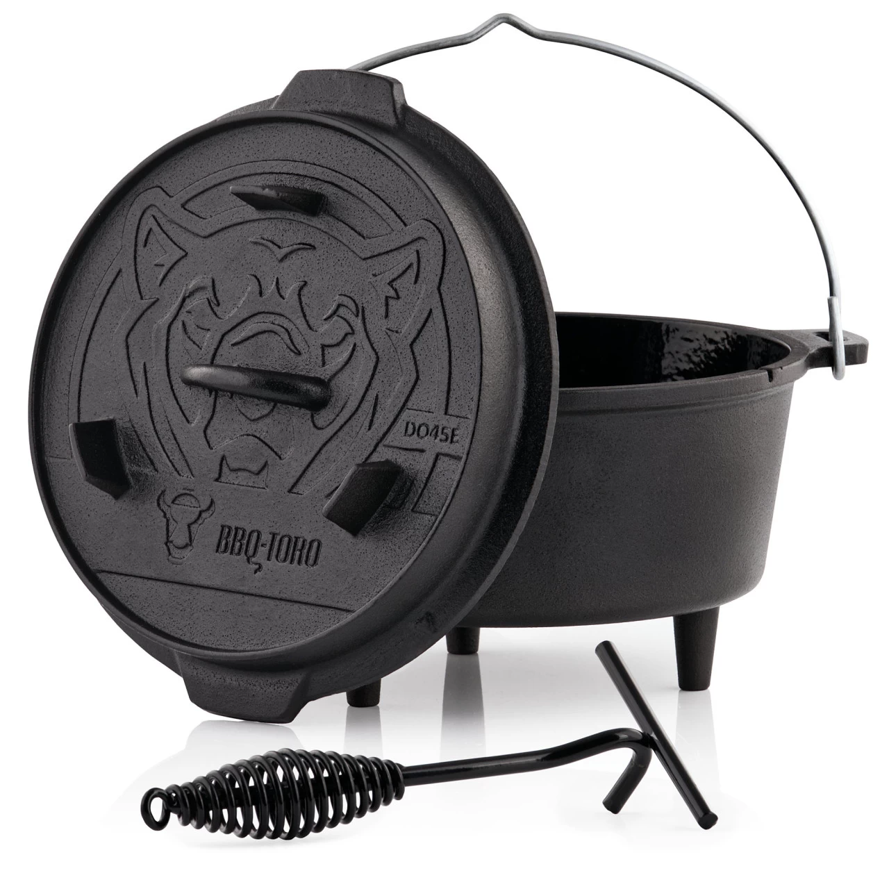 Ein schwerer, traditioneller, gusseiserner Topf und ein exakt passender Deckel mit dem man überall kochen, braten, schmoren, frittieren, dünsten und backen kann. Egal ob Feuerstelle, Grillplatz oder Lagerfeuer, er ist mobil und flexibel einsetzbar. Der extra erhöhte Deckelrand und die drei Beine bieten optimale Bedingungen für Kohle und Co.