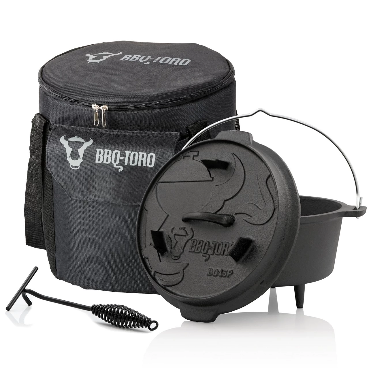 Im BBQ-Toro Dutch Oven Set ist ein 4.5 QT Feuertopf mit ca. 4,2 Liter Fassungsvermögen enthalten. Die drei Beine bieten stabilen Stand und auf dem Deckel mit erhöhtem Rand finden reichlich Kohlen, Glut oder Briketts Platz. Der Deckel des Dutch Oven hat ebenfalls Füße und kann umgedreht hervorragend als Grillpfanne oder Servierteller genutzt werden. Der Dutch Oven ist bereits eingebrannt und kann sofort genutzt werden. Mit dem praktischen Deckelheber kann der heiße Deckel des Dutch Ovens sicher und gefahrlos aufgesetzt und angehoben werden.