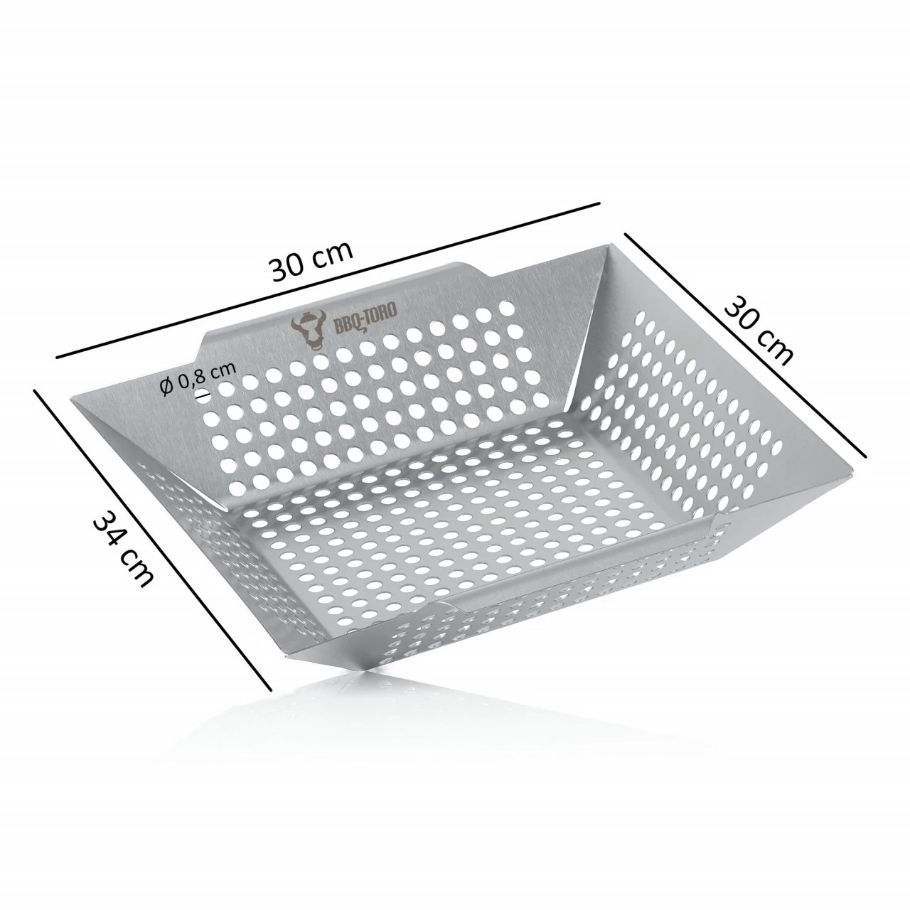 Der Grillkorb bietet auf 30 x 30 x 5,5 cm genügend Platz für Grillbeilagen wie Kartoffeln, Gemüse, Pilze oder Obst. Die Grillpfanne kann nicht nur zum Garen, sondern auch zum Grillen von Grillgut genutzt werden.