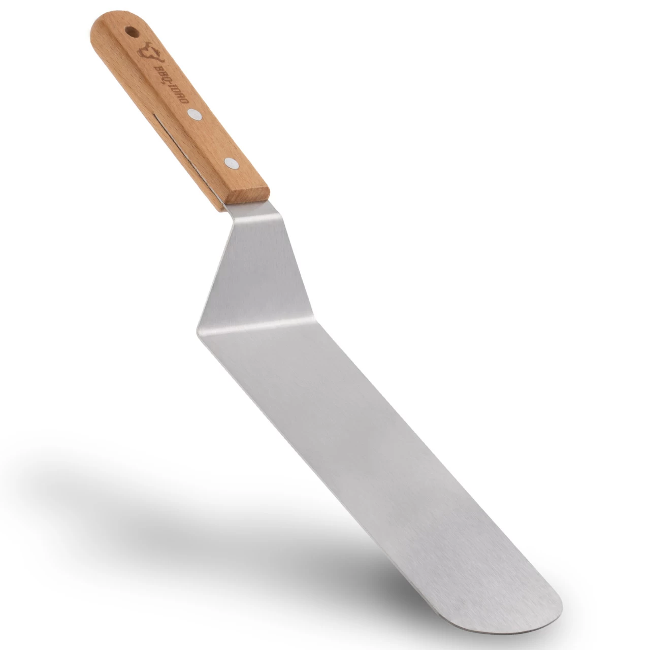 Der im Lieferumfang enthaltene Spachtel eignet sich ideal zum Wenden von kleinem und großem Grillgut, wie Burger-Patties, Gemüse, Pfannkuchen, Omelettes und vielem mehr. Dank der scharfen Kanten können Sie zudem Ihr Grillgut in mehrere Stücke teilen.
