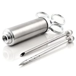 Zum Lieferumfang der Fleischmarinierspritze gehören 2 verschiedene Nadeln, die mit einem Schraubverschluss schnell und leicht ausgetauscht werden können. Die Nadel mit seitlichen Löchern ist für Flüssigkeiten geeignet und sorgt für eine gleichmäßige Verteilung der Marinade im Fleisch. Die Nadel mit großem Endloch kann festere Stoffe wie gehackten Knoblauch, Zwiebeln oder Kräuter direkt ins Fleisch spritzen. Die Pökelspritze wird mit Ersatzdichtungen sowie praktischer Stofftasche geliefert.