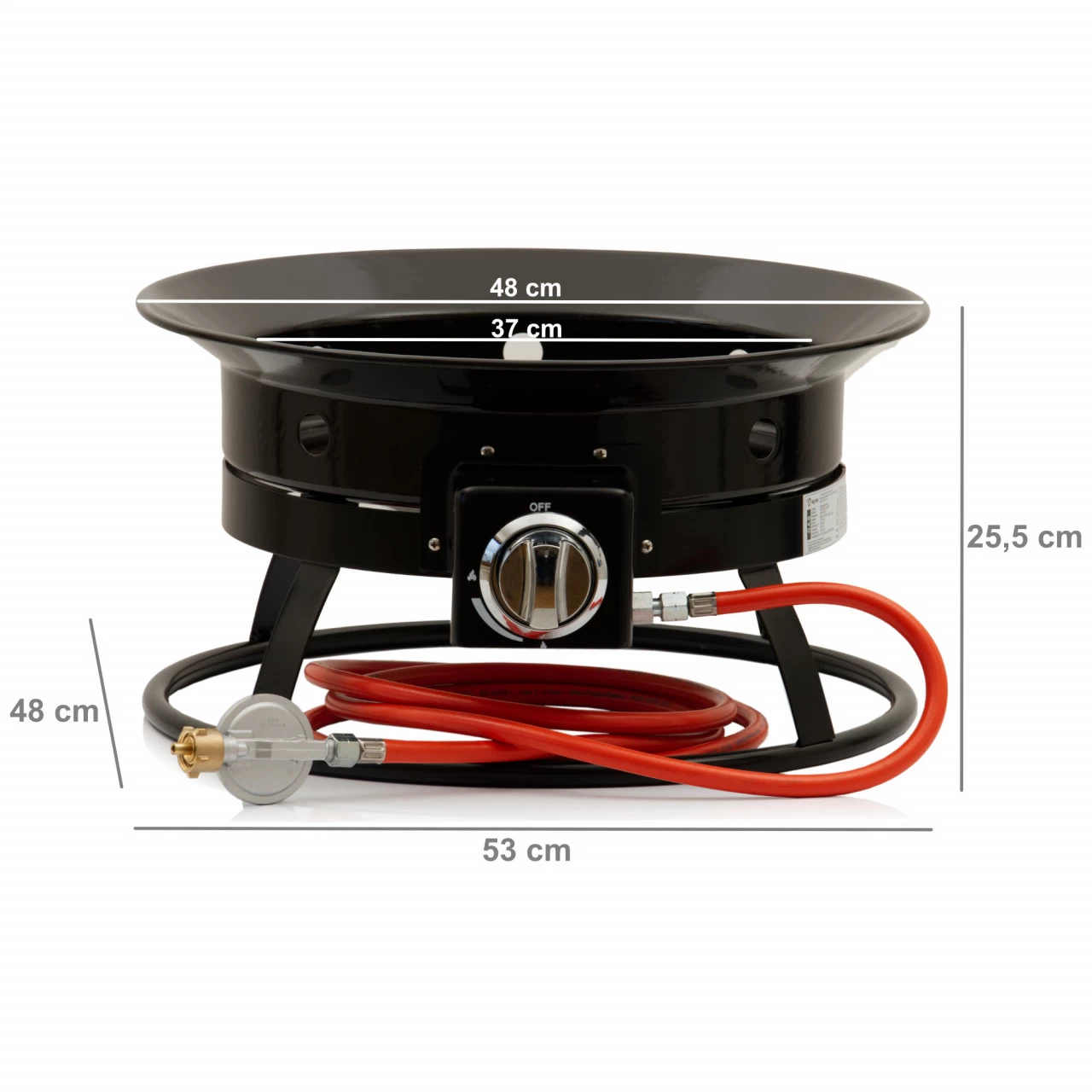 – Lieferumfang: 1x Feuerschale, 1x Druckminderer / Schlauch, 1x Lavasteine, 1x Montageanleitung