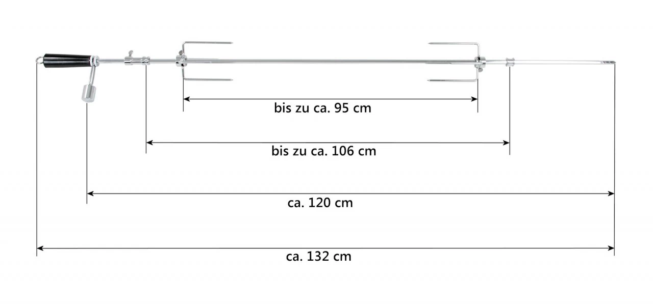 Der 120-cm-lange, massive Grillspieß hat einen Durchmesser von 0,9 cm ist verchromt. Der mitgelieferte Motor packt, gleichmäßig verteiltes Grillgut, bis zu ca. 4 kg. Mit ca. 2 Umdrehungen pro Minute wird Ihr Braten knusprig gegrillt und bleibt saftig.