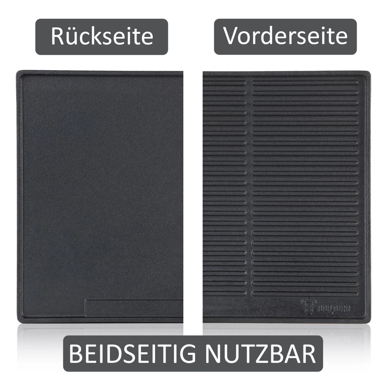 Die Grillplatte von BBQ-Toro ist nicht nur für Profis! Hiermit kann jeder braten, kochen und grillen – ob Spiegelei, Steak oder Pancakes, diese Plancha ist flexibel einsetzbar. Da die Wendeplatte eine Rippenstruktur und eine glatte Seite hat, können Sie die Gussplatte vielseitig einsetzen.