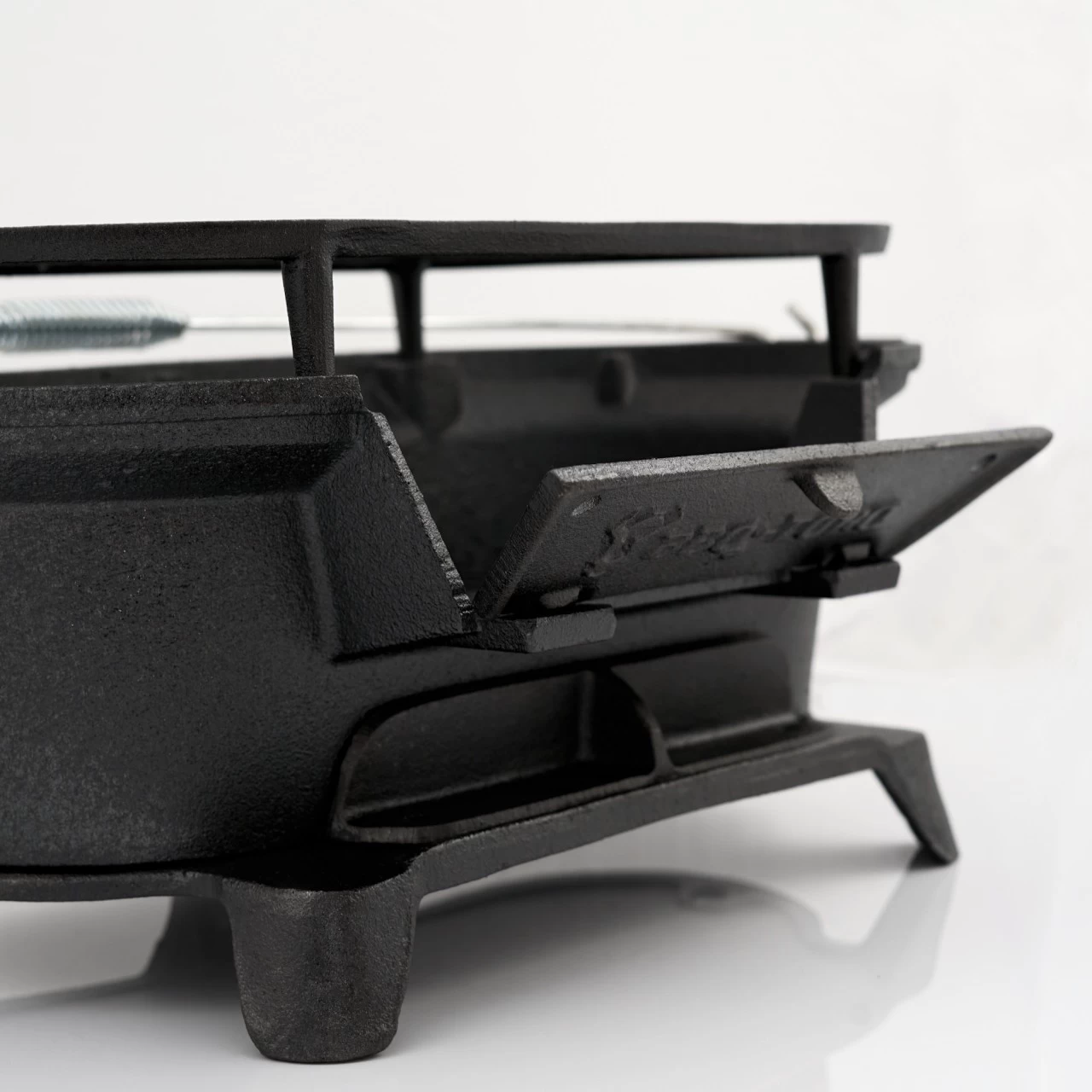 Vorne am Grilltopf befindet sich eine Klappe. Bei Öffnen der Klappe kann man ideal Grillkohle nachlegen ohne das Grillrost zu entfernen. Unterhalb der Klappe liegt der Lüftungsschieber. Mittels diesem lässt sich die Zuluft regulieren.