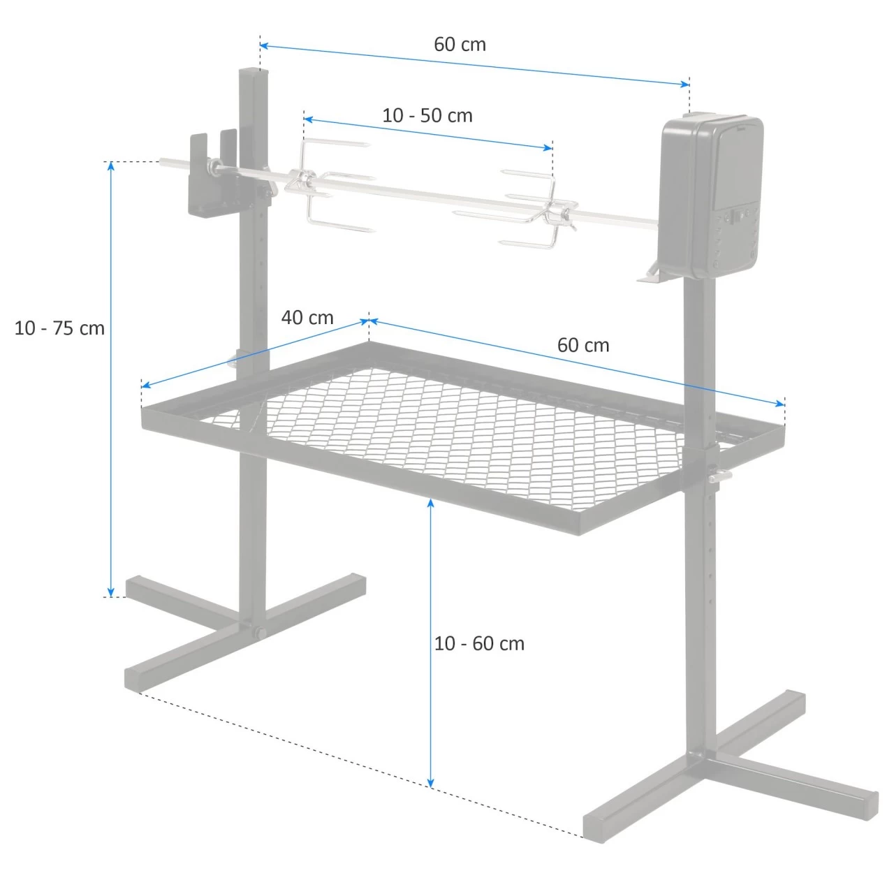 – Lieferumfang: 1x Spieß, 1x Motor, 1x Motorhalter, 1x Untergestell (wie abgebildet), 2x Fleischnadeln, 1x Lager und 1x Lagerhalter