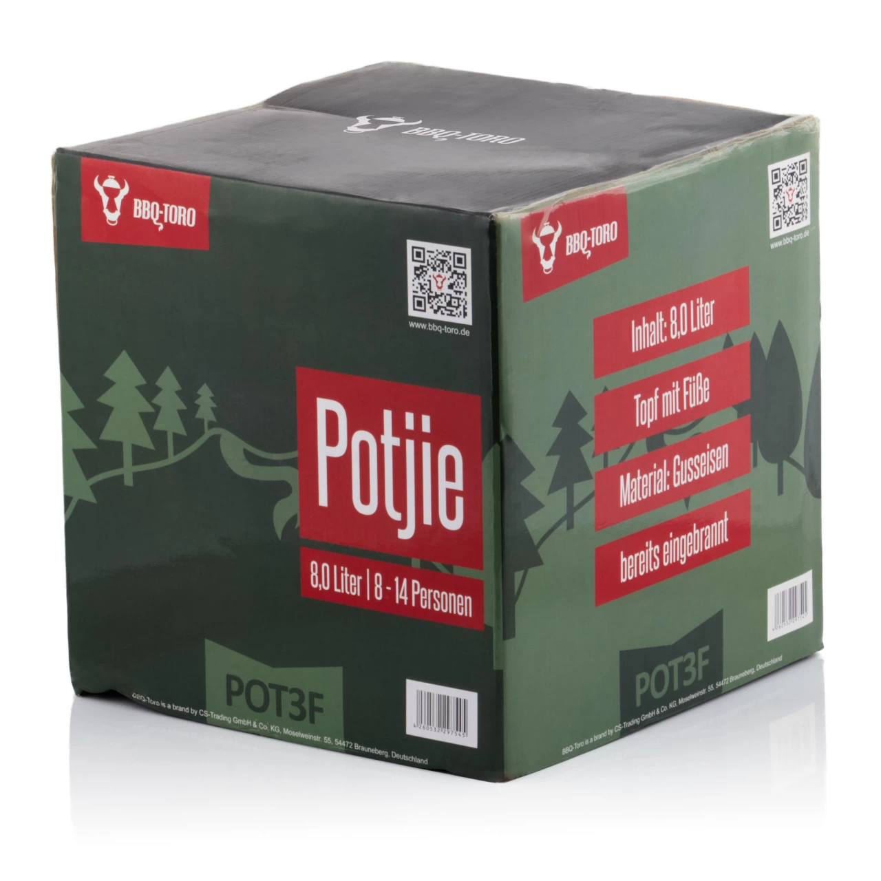 Der Potjie ist ein schwerer, traditioneller, gusseiserner Topf und ein exakt passender Deckel mit dem man überall kochen, braten, schmoren, frittieren, dünsten und backen kann. Der Potjie reguliert dank seiner hohen Masse (Gusseisen) die Hitze und ermöglicht so ein gleichmäßiges Garen. Einfach glühende Kohlen, Glut oder Grillbriketts auf den Deckel und unter den Topf geben und das Potjie-Erlebnis kann losgehen. Der extra erhöhte Deckelrand und die Topffüße bieten optimale Bedingungen für Kohle und Co. Alternativ kann der Potjie ganz einfach ins Feuer gestellt oder an einen Schwenkgrill gehängt werden.