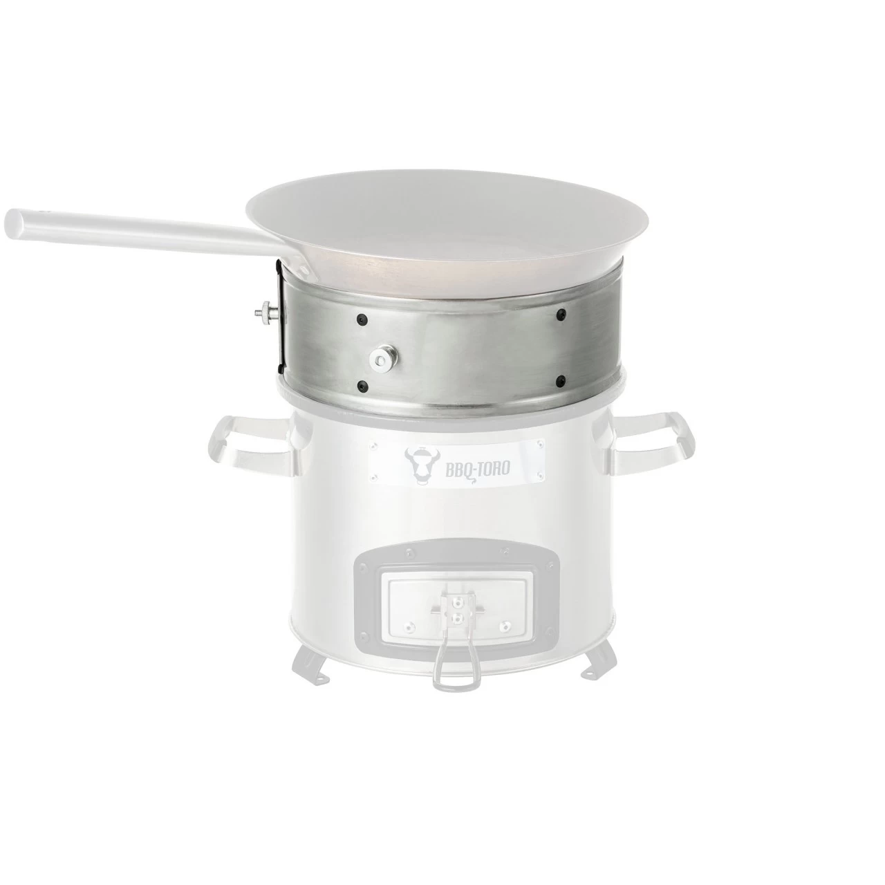 Setzen Sie den BBQ–Toro Power Ring auf den oberen Rand Ihres Raketenofens. Nun können Sie den Durchmesser des Power Rings ganz einfach anpassen, indem Sie Schraube arretieren. Der Ring sollte im unteren Bereich eng anliegen. Im Anschluss stellen Sie Ihren Dutch Oven, Gusspfanne oder Gusstopf auf den Ring.