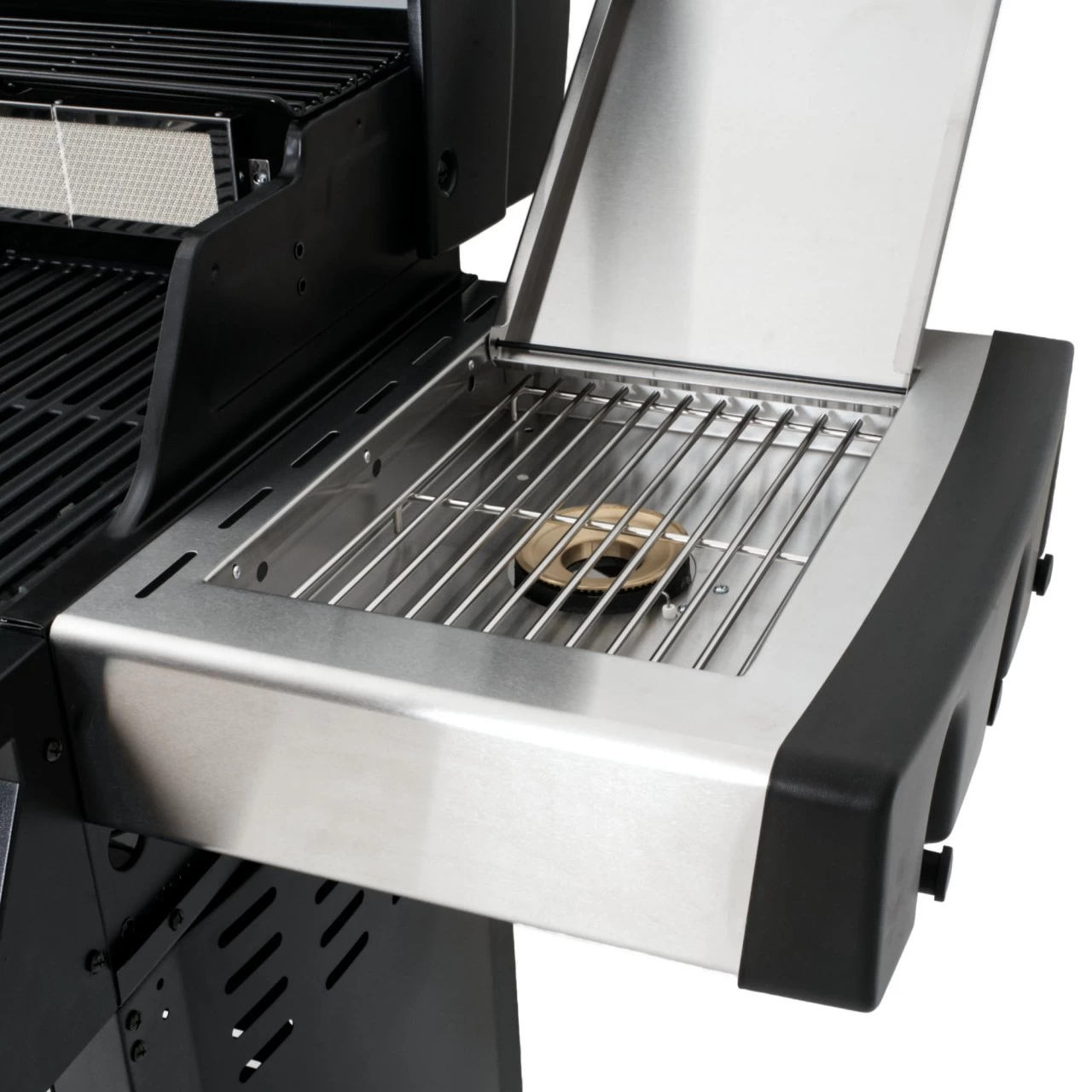 Die seitliche Kochstelle eignet sich insbesondere zur Zubereitung von Soßen und Beilagen, wie Spiegeleier oder Bratkartoffeln. Wird der Seitenbrenner nicht mehr benötigt, kann dieser zugeklappt und als weitere Ablagefläche für Grillgut, Geschirr, Öl oder Gewürze genutzt werden.