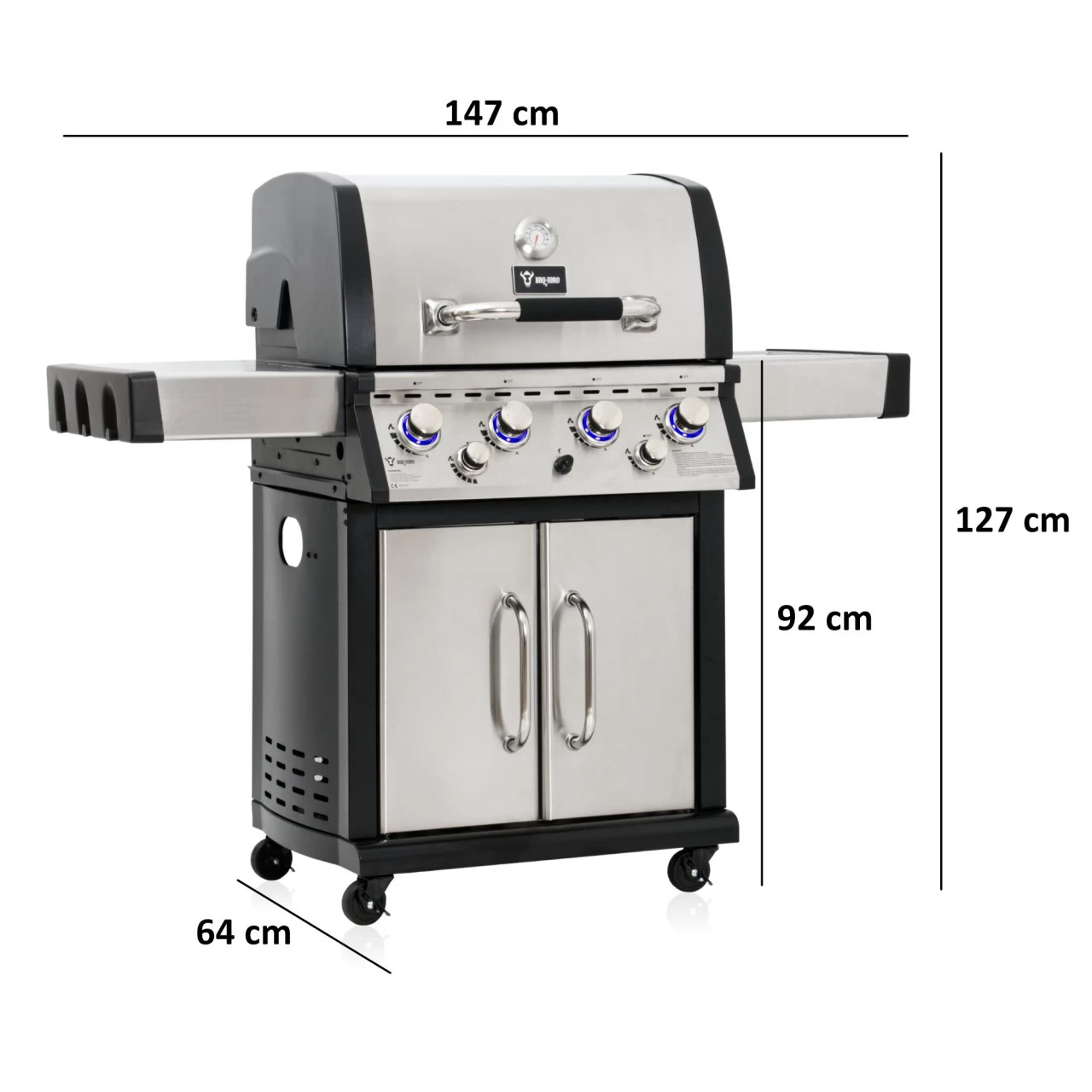 – Maße (Haupt-) Grillfläche: (B) 64 x (T) 45 cm (zwei Grillroste à 45 x 32 cm)