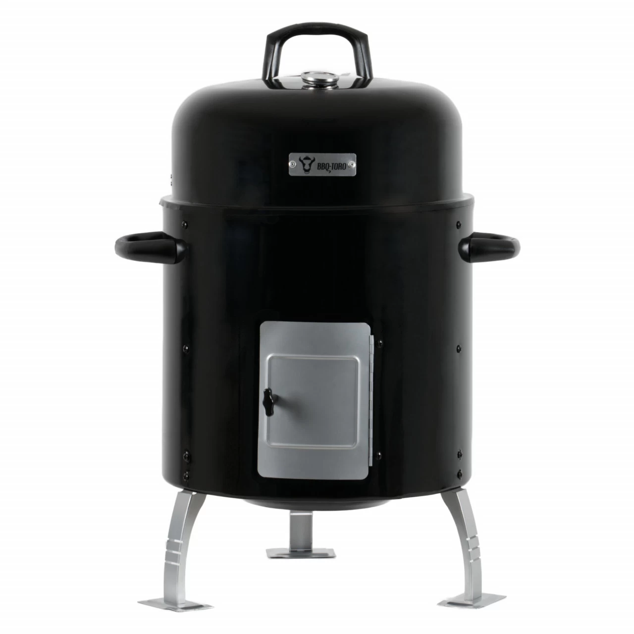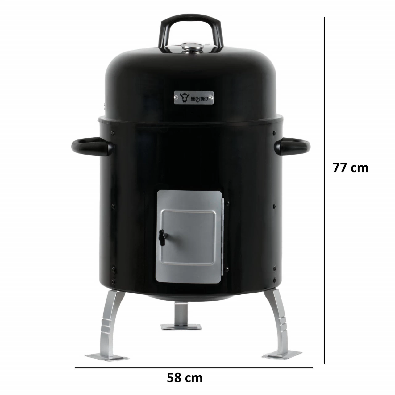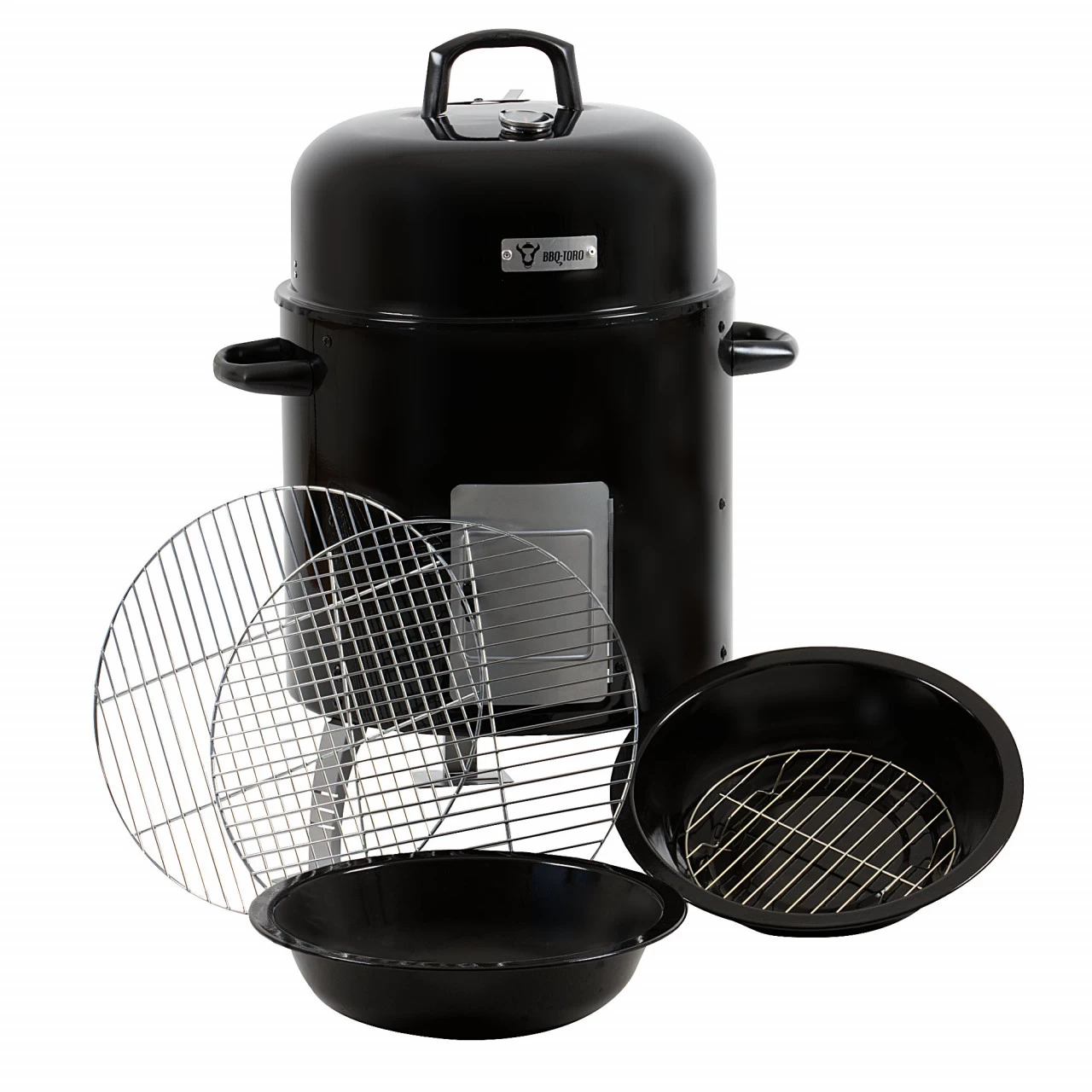 Mithilfe der integrierten Wasserwanne kann ein besserer Temperaturausgleich stattfinden und die Speisen werden saftiger. Die große Tür an der Vorderseite eignet sich ideal zum Nachlegen von Grillkohle, Briketts oder Räucherchips.
