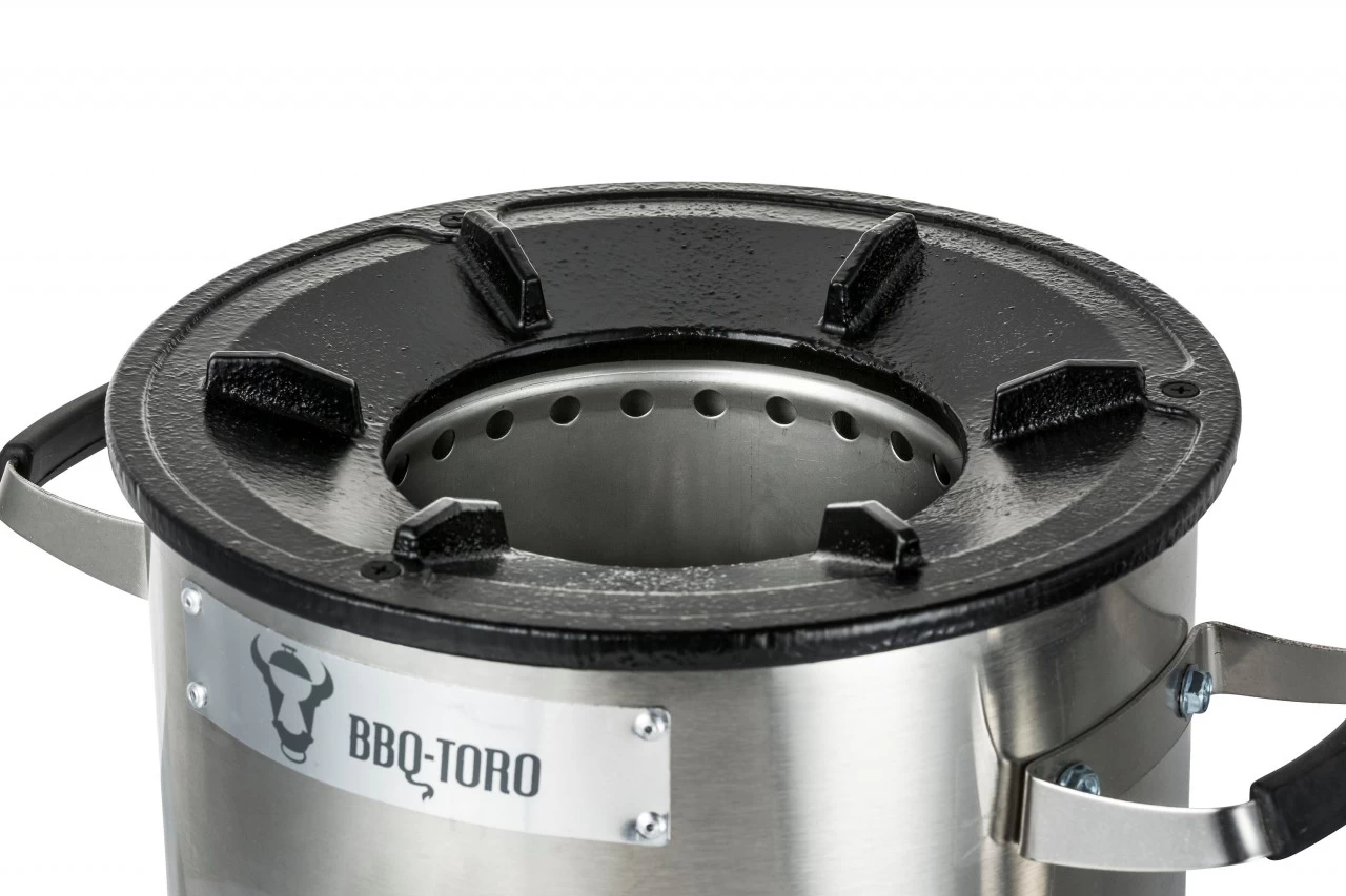 Die Nutzung im Freien ist auch bei windigem Wetter gar kein Problem. Dank dem Kamineffekt (Luftzug von unten) wird das Holz effektiv verbrannt. Die Flammen steigen durch eine Öffnung in der Mitte des Ofens bis zum gusseisernen Ring. Diese einzigartige Konstruktion hat viele Vorteile. Zum Einen ermöglicht es eine vollständige Verbrennung der Materialien – es ist eine nahezu geruchlose, rauchfreie Flamme ohne Funkenflug – und zum Anderen kann die entweichende Hitze zum Kochen genutzt werden.