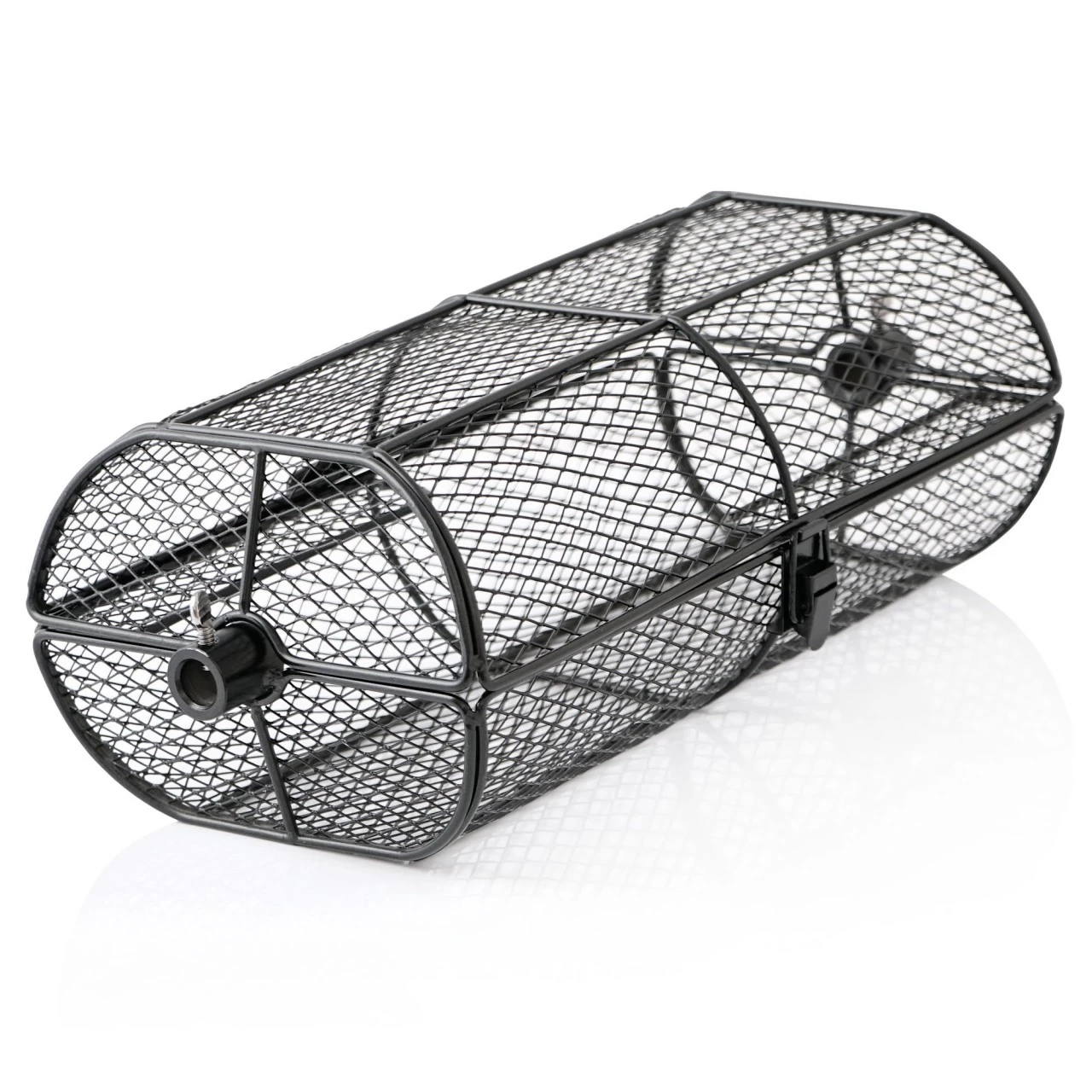 Grillkorb aus Stahl mit Teflonbeschichtung. Die beiden Wendegitter im Inneren des Korbs sorgen für dauerhafte Bewegung und gleichmässige Garung des Grillguts.