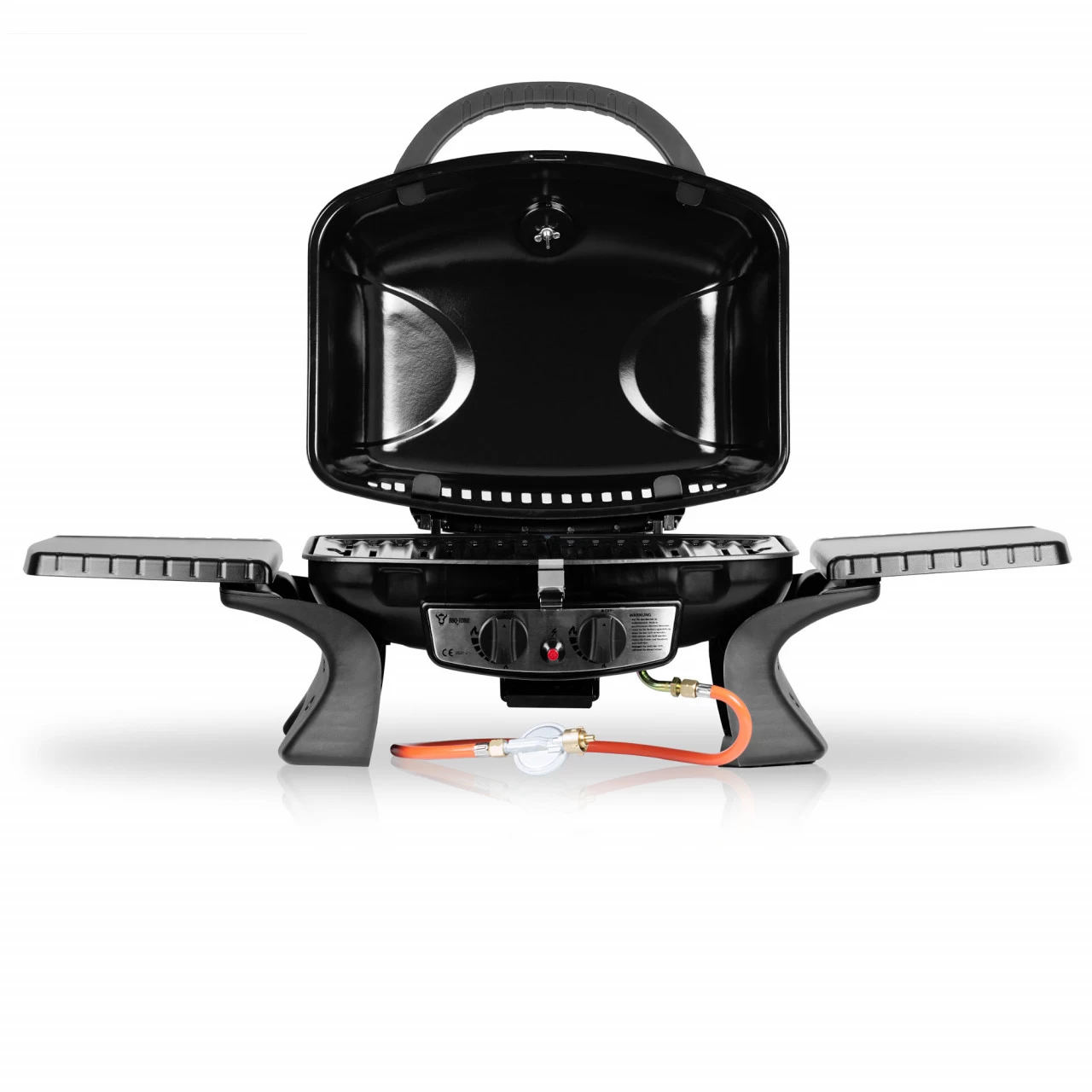 – Lieferumfang: 1x Tischgasgrill, 2x Clip-On-Seitentische, 1x Deckelthermometer, 2x Grillrost, 1x Gasanschlussschlauch und 1x Druckminderer