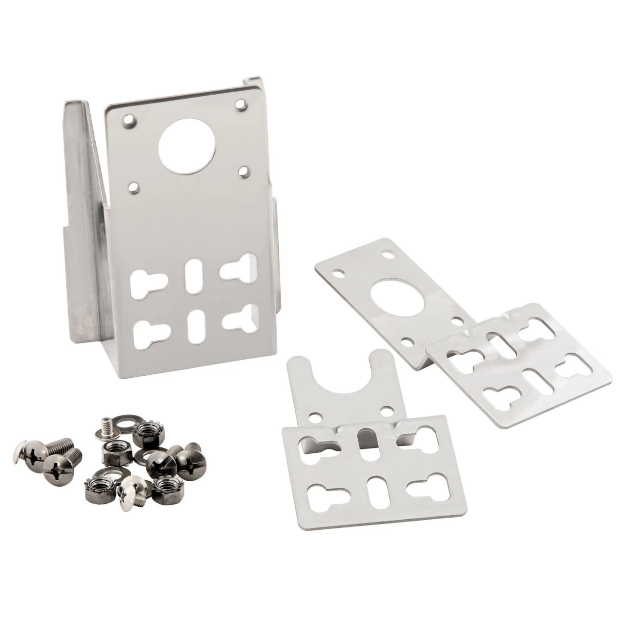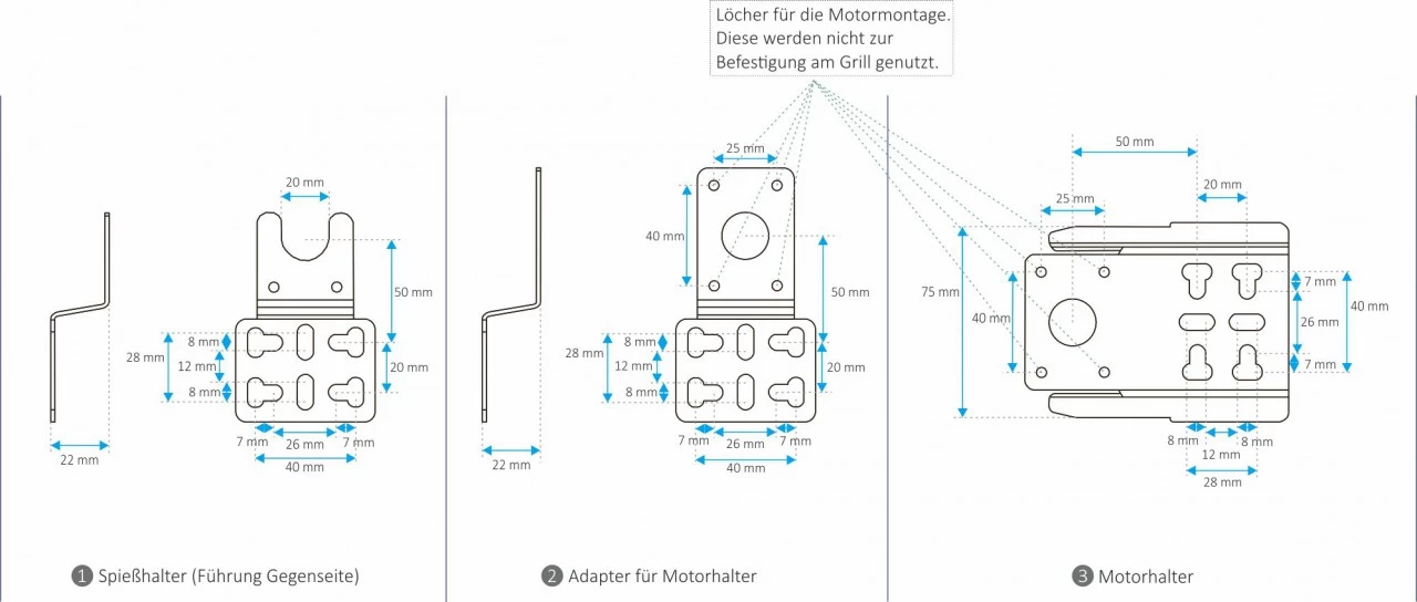 Das universelle Halter Set wird inklusive Befestigungsmaterial geliefert. Dank der festen und variablen Befestigungslöcher kann die Motor Halterung kinderleicht an nahezu jeden Grill angebracht werden.
