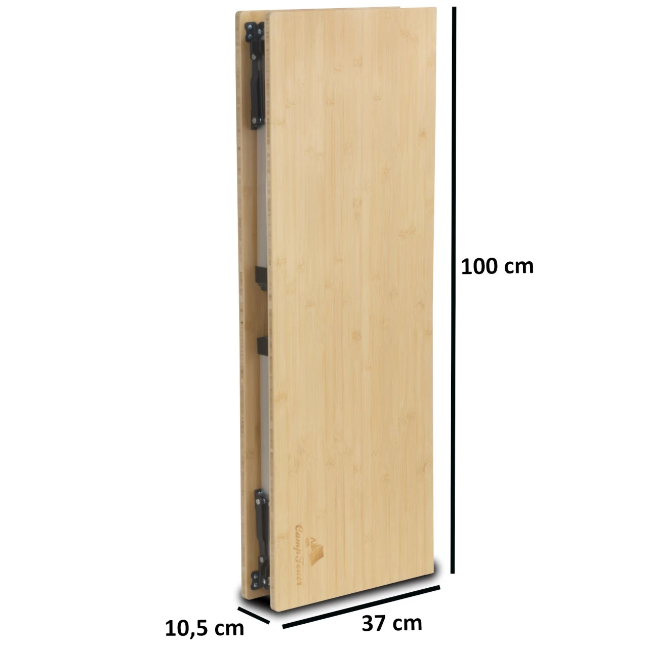 Die stabile Aluminiumkonstruktion macht den Tisch leicht und handlich. Die Tischplatte besteht aus 100% Bambus und ist nicht nur robust und pflegeleicht, sondern weist auch eine hohe Belastbarkeit von bis zu 50 kg.