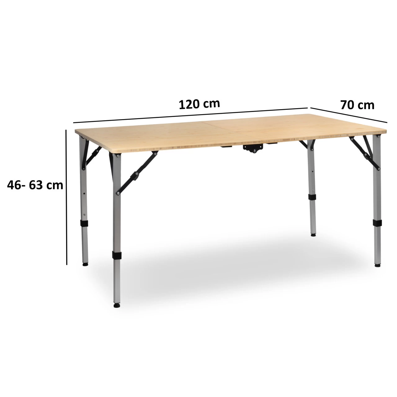 Die stabile Aluminiumkonstruktion macht den Tisch leicht und handlich. Die Tischplatte besteht aus 100% Bambus und ist nicht nur robust und pflegeleicht, sondern weist auch eine hohe Belastbarkeit von bis zu 50 kg.