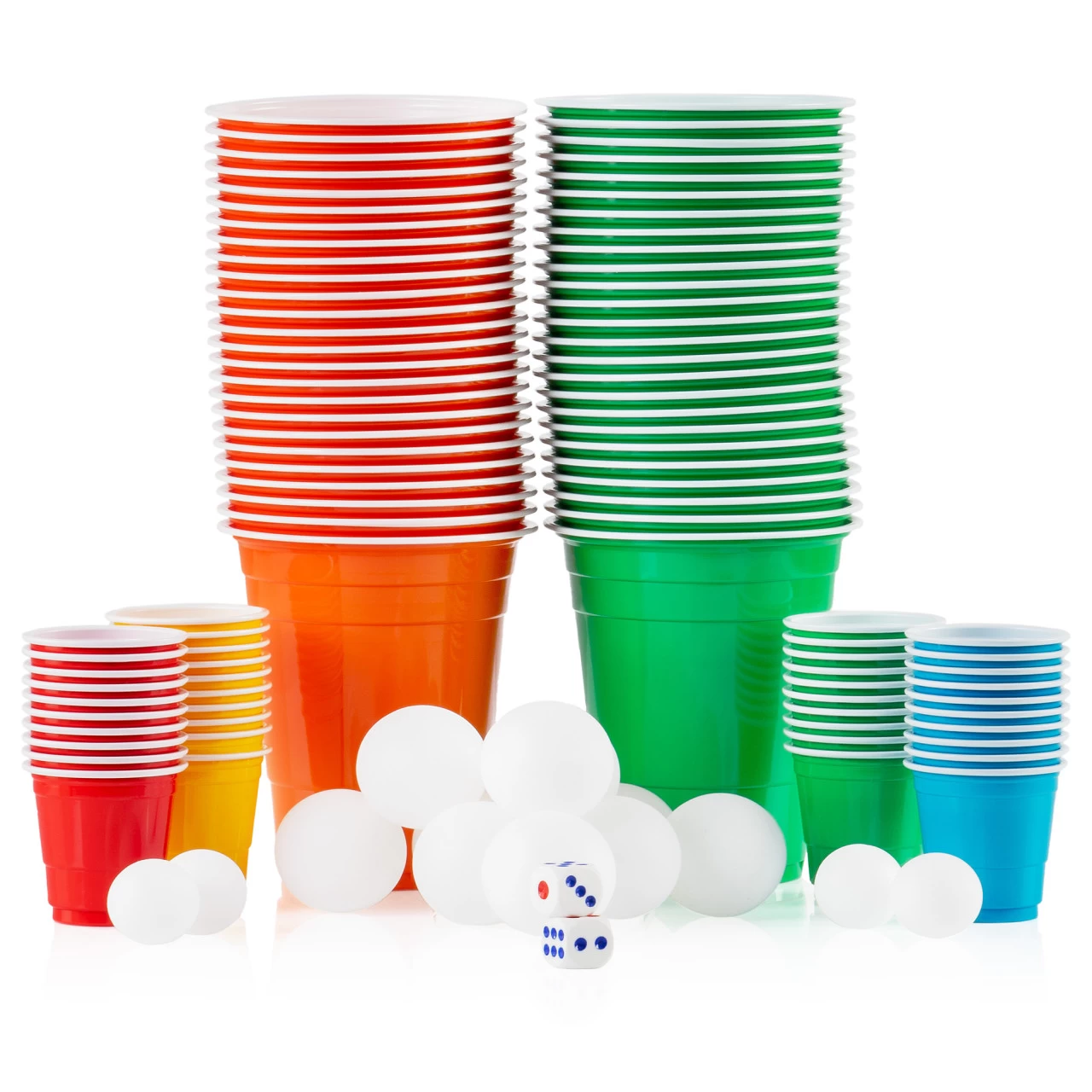 Das Bierpong-Set ist komplett ausgestattet mit insgesamt 106 Teilen, sodass Sie sofort loslegen können. Enthalten sind 2 x 25 große Becher, 4 x 10 Shotbecher, 10 große und 4 kleine Tischtennisbälle sowie 2 Würfel. Somit können Sie sich ganz auf den Spielspaß konzentrieren, ohne sich Gedanken über fehlendes Zubehör machen zu müssen.