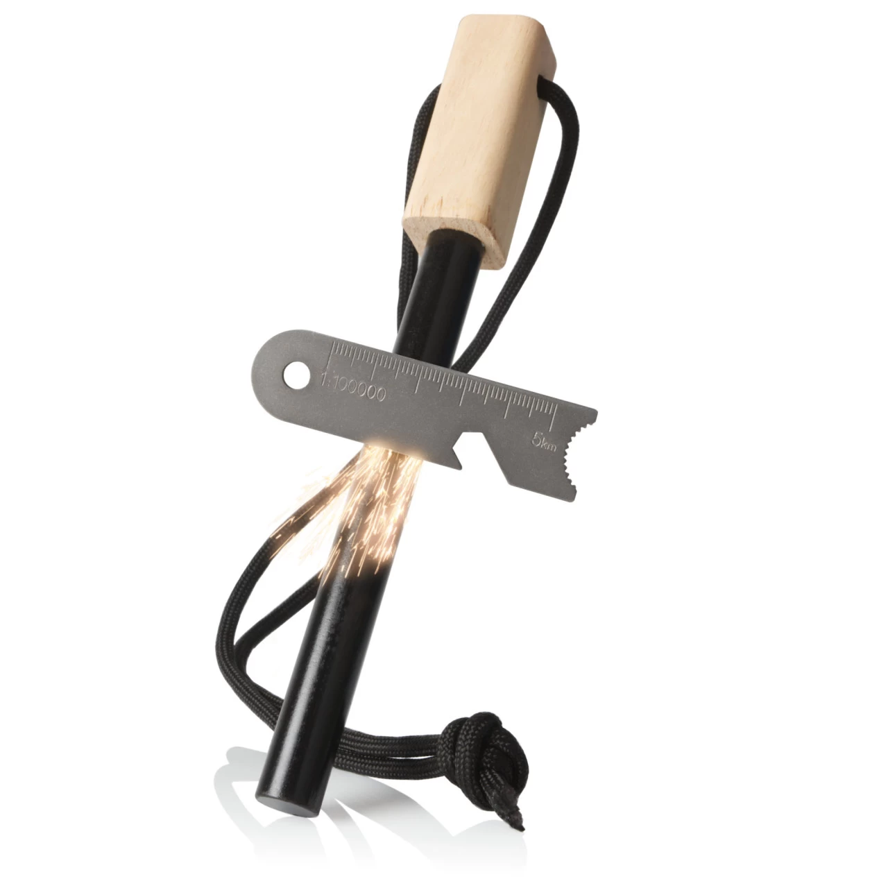 Der Feuerstahl lässt sich mit nur wenigen Handgriffen ganz einfach mithilfe des Multi-Tools entzünden. Dazu einfach leicht entzündbares Brennmaterial oder den Zunder bereitlegen, darüber den Feuerstahl am Griff halten und mit dem Feuerstarter den Stahl von oben nach unten schnell abschaben. Dabei so viel Druck ausüben, dass Funken sprühen.
