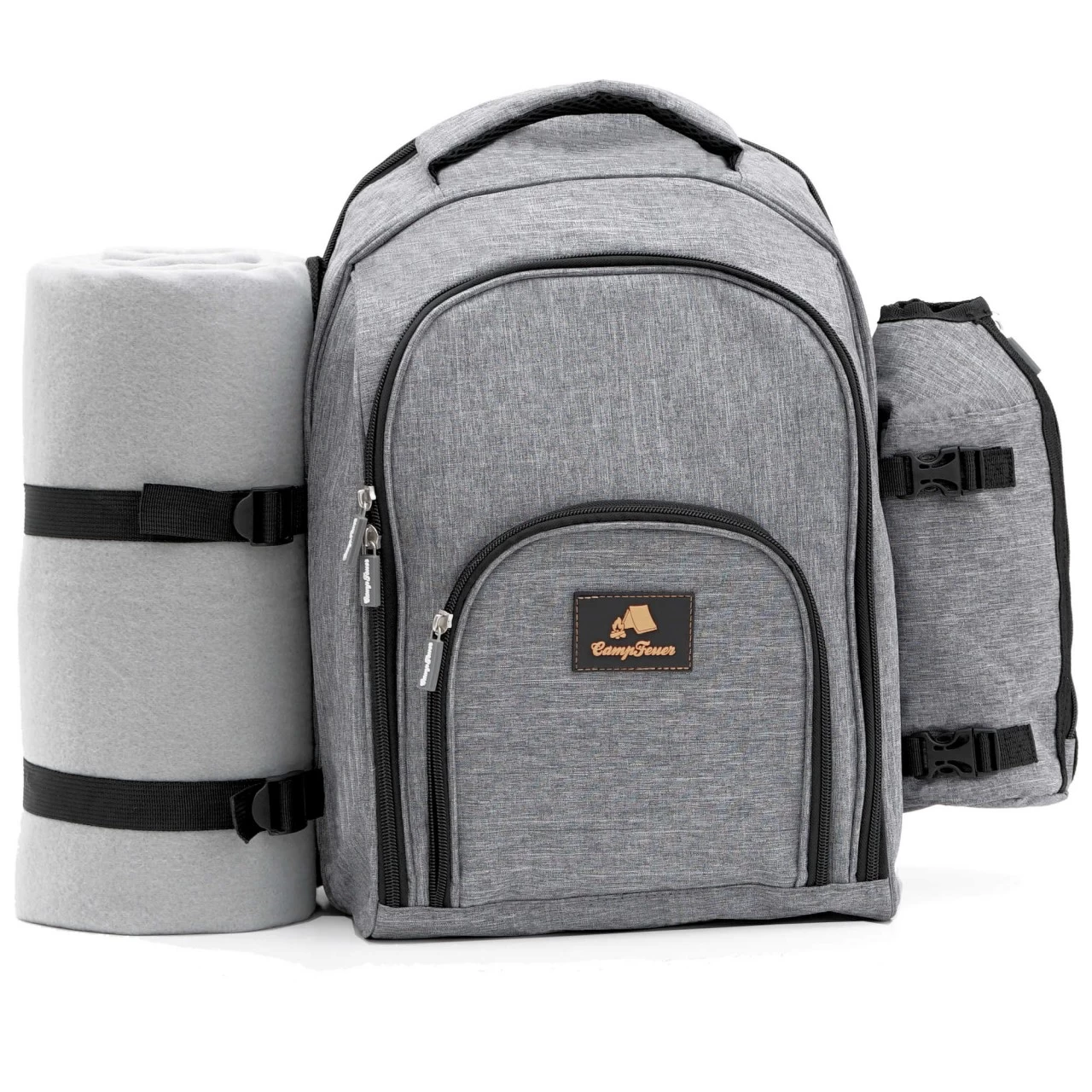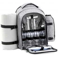 Der CampFeuer Picknickrucksack beinhaltet ein großes Geschirrfach mit Besteck, Gläser, Teller, Servietten, Käse-/Brotmesser, Korkenzieher, Schneidebrett und Salz- und Pfefferstreuer, ein geräumiges Kühlfach, einen Flaschenbeutel und eine Picknickdecke – alles, was Sie für ein gelungenes Picknick mit vier Personen benötigen.