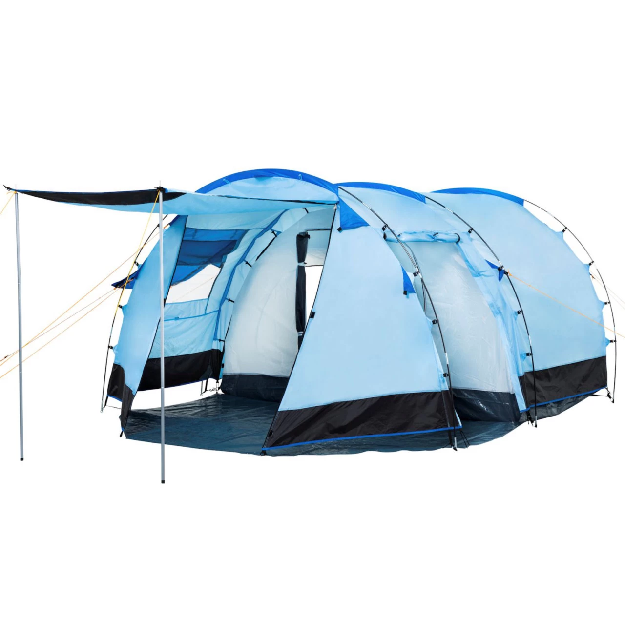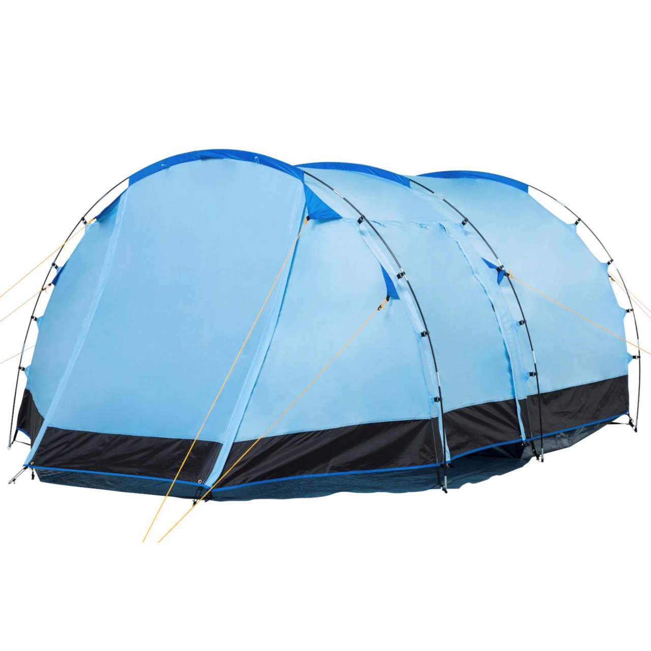 Das Tunnelzelt bietet mit seinen großen 410 x 260 x 150 cm genügend Platz für 4 Personen. Der Zeltstoff ist aus 190T Polyester und hat zusätzlich eine PU-Beschichtung. Mit einer Wassersäule von 3000 mm schützt Sie der Zeltstoff ideal vor Regenschauern. Der Boden ist aus PE-Folie gefertigt. Mit einem Packmaß von 64 x 19 cm und einem Gewicht von ca. 7,9 kg ist das Zelt handlich zu transportieren. Das Zelt wird, in einer Tasche gepackt, geliefert. Desweiteren liegen dem Lieferumfang: Fiberglasgestänge, Aufstellstangen, Erdnägel und Abspannseile bei.