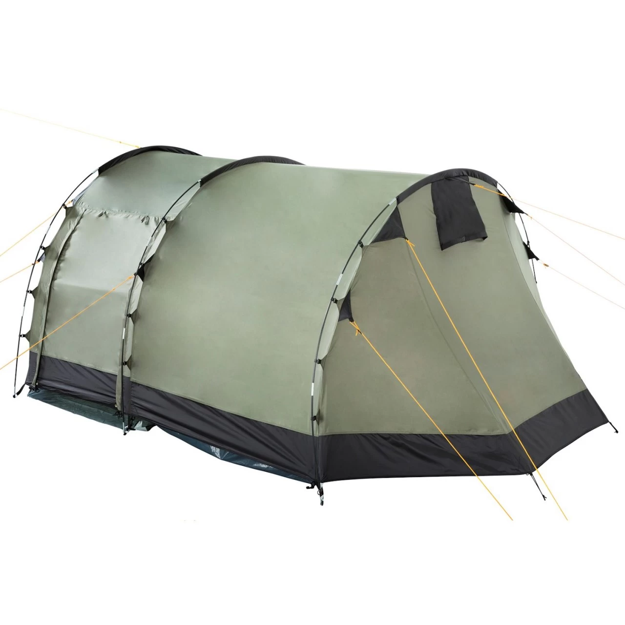 Das Tunnelzelt bietet mit seinen großen 410 x 260 x 150 cm genügend Platz für 4 Personen. Der Zeltstoff ist aus 190T Polyester und hat zusätzlich eine PU-Beschichtung. Mit einer Wassersäule von 3000 mm schützt Sie der Zeltstoff ideal vor Regenschauern. Der Boden ist aus PE-Folie gefertigt. Mit einem Packmaß von 64 x 19 cm und einem Gewicht von ca. 7,9 kg ist das Zelt handlich zu transportieren. Das Zelt wird, in einer Tasche gepackt, geliefert. Desweiteren liegen dem Lieferumfang: Fiberglasgestänge, Aufstellstangen, Erdnägel und Abspannseile bei.