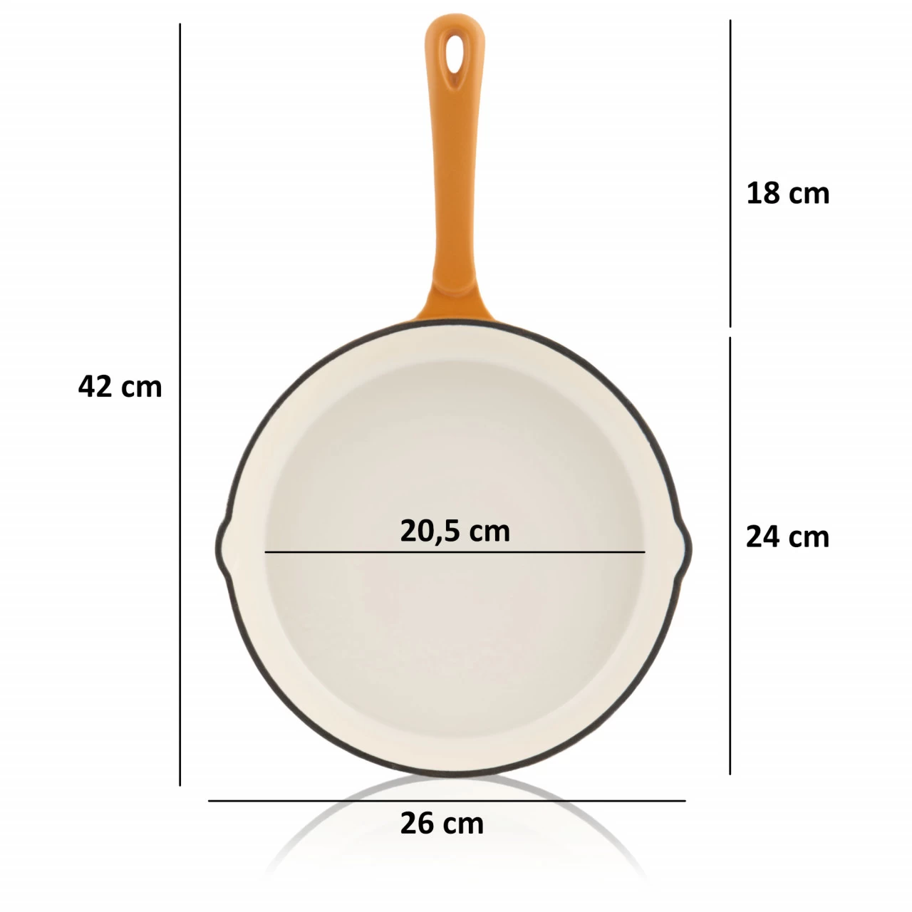 Die emaillierten Gusseisenpfannen von Mahlzeit eignen sich bestens zum Braten, Schmoren, Kochen und Zubereiten von Fleisch, Fisch, Gemüse und vielen weiteren Gerichten. Die Gusseisen-Pfannen verfügen über eine gute Wärmeleitung und verteilen die Hitze gleichmäßig auf das Bratgut.