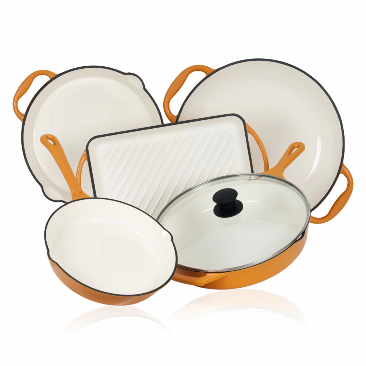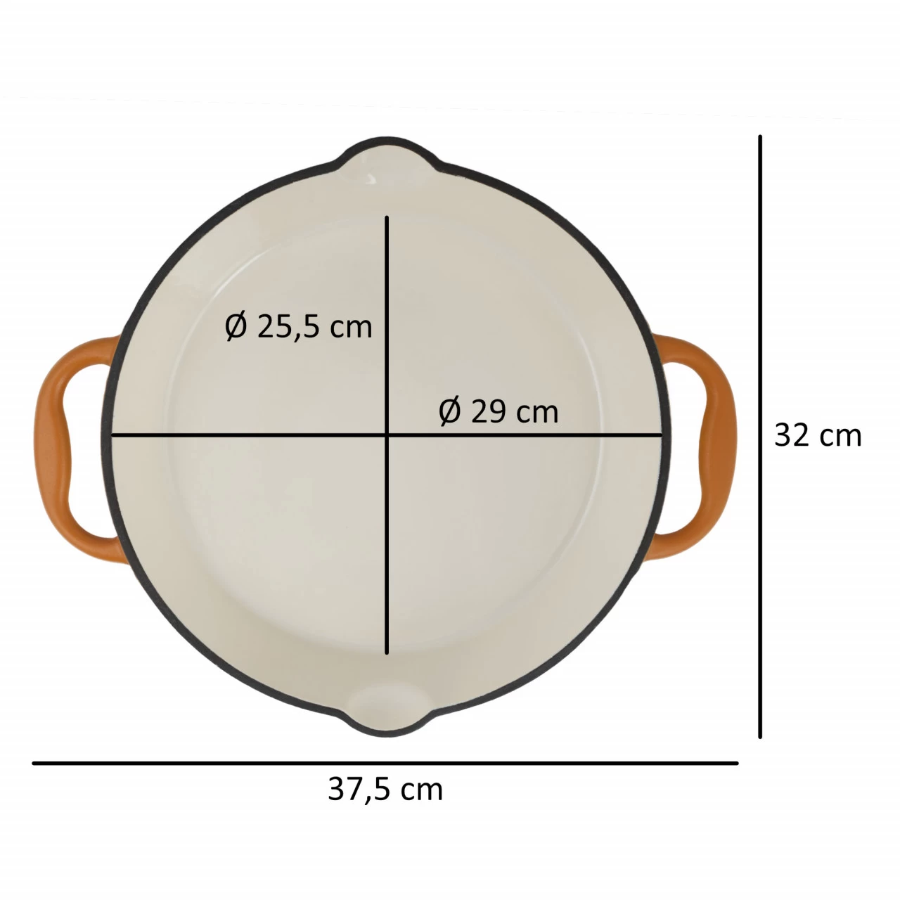 – 5-teiliges Set bestehend aus 3 emaillierten Gusseisenpfannen, einer Grillplatte und einer Paella-Pfanne