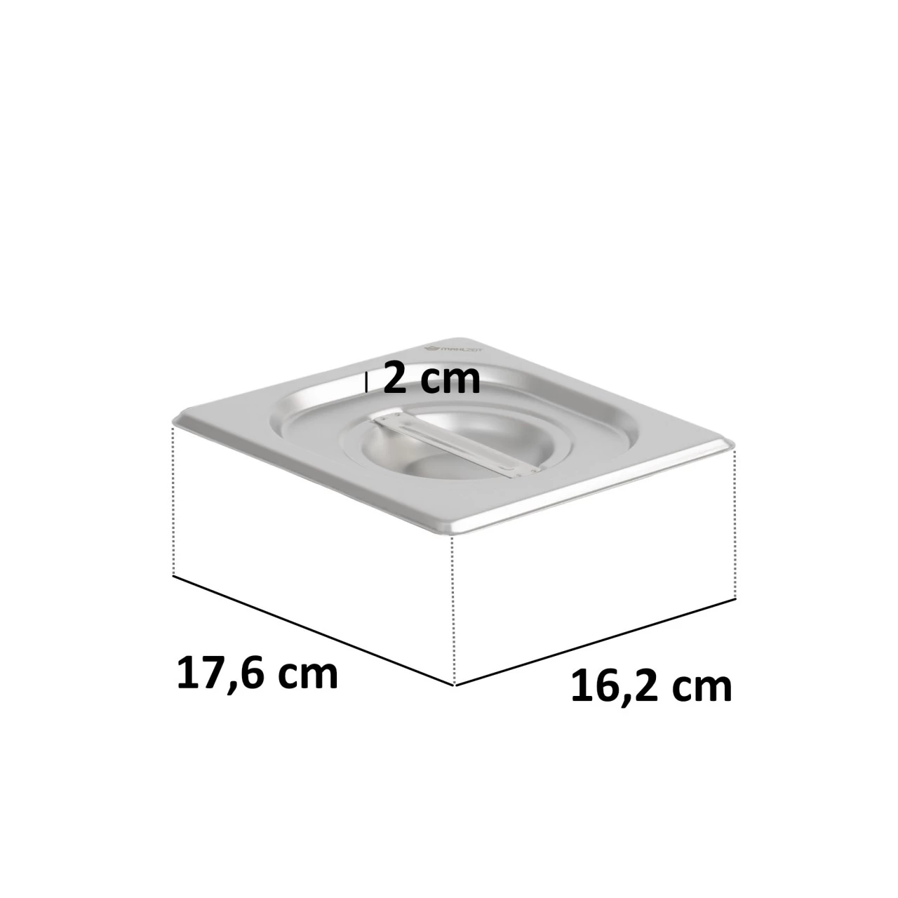 Der 1/6 GN Deckel besitzt ein Außenmaß von (B) 17,6 x (T) 16,2 cm und eine Materialstärke von 0,7 mm.