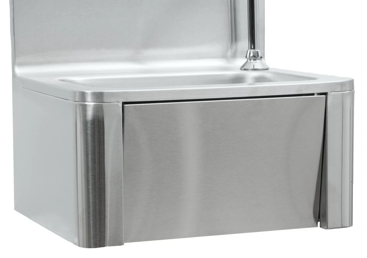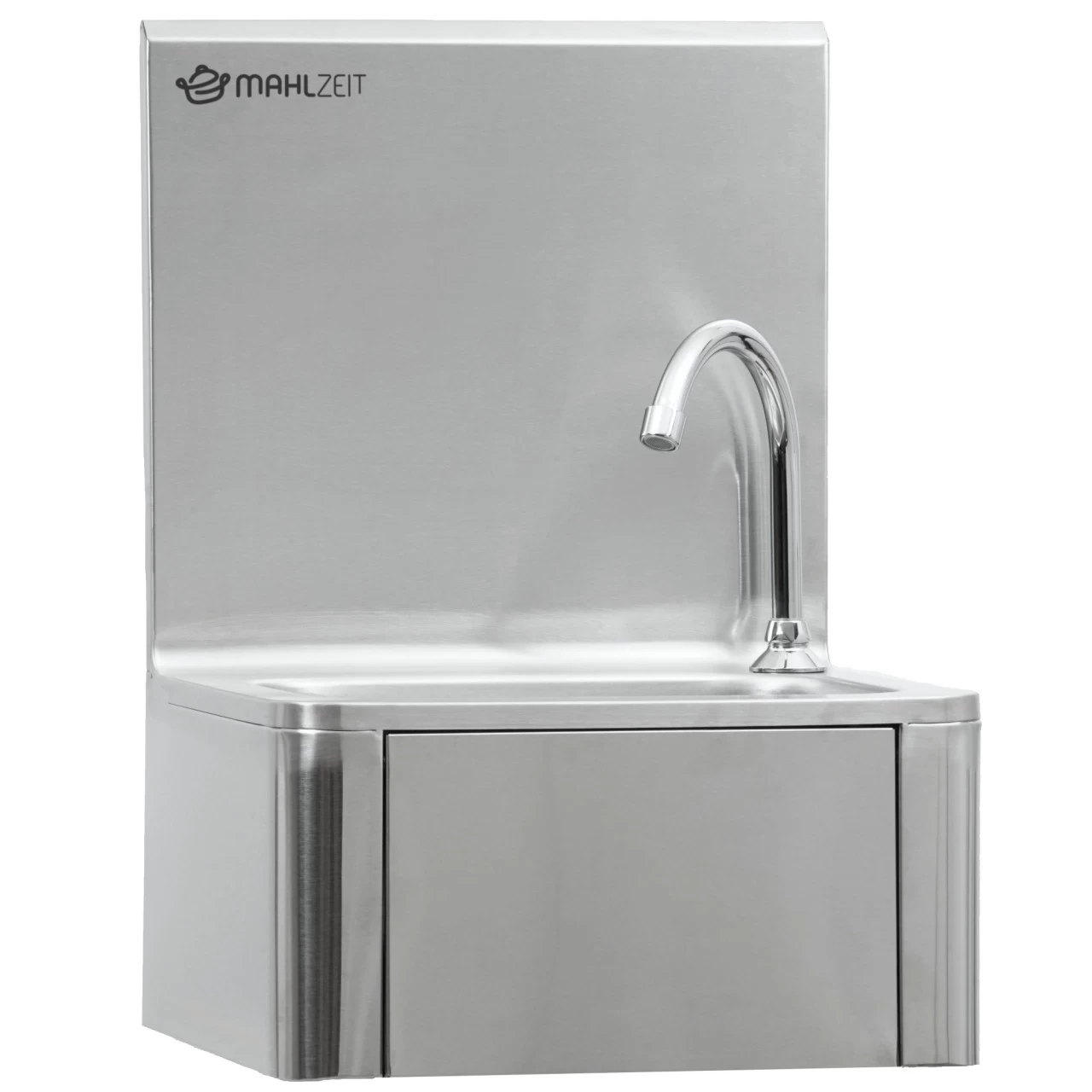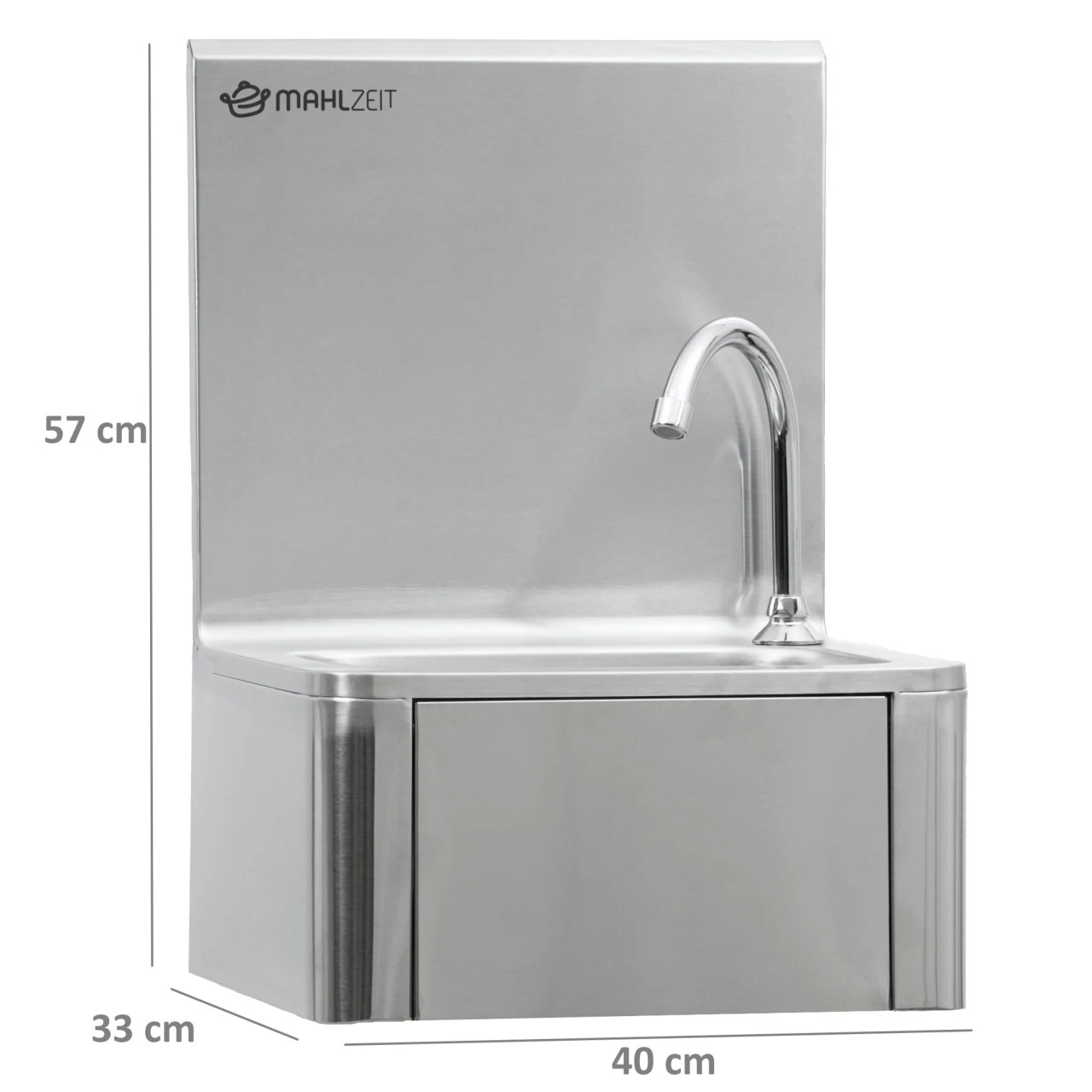 Das Mahlzeit Handwaschbecken ist die ideale Hilfe für Küche, Garage, Gastronomie, Großküchen, Kantinen und mehr. Das Waschbecken ist aus hochwertigem V2A Edelstahl gefertigt und kann ganz bequem mit dem Knie betätigt werden. Durch einfachen Druck auf die komfortabel große Kniebetätigung aktivieren Sie den Wasserfluss. Somit können Sie verschmutzte Hände direkt mit Wasser und ohne jeglichen anderen Kontakt hygienisch waschen. Mit dem Mischventil kann der Kaltwasseranschluss und der Warmwasseranschluss angeschlossen werden. Die gewünschte Temperatur kann mittels des Mischventils geregelt werden. Mit einer Größe von (B) 40 x (T) 33 x (H) 57 cm bietet das Waschbecken ausreichend Platz zum Waschen, Spülen und vieles mehr. Dank des V2A Edelstahl lässt sich das Becken im Anschluss einfach und schnell reinigen.