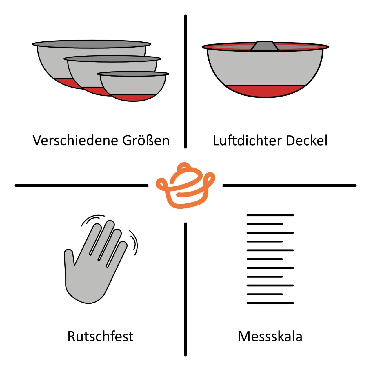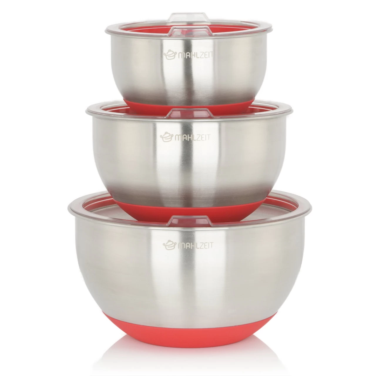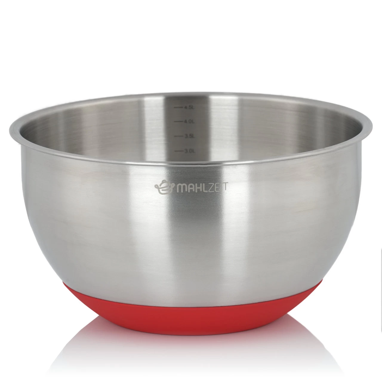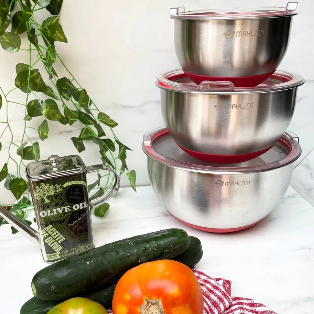 Jede Edelstahl Schüssel ist mit einem Silikonboden ausgestattet, der nicht nur verhindert, dass der Boden die Arbeitsfläche zerkratzt, sondern auch für Stabilität beim Mischen, Kneten oder Rühren von Speisen sorgt. So können Sie mühelos alle Ihre Lieblingszutaten und -speisen mischen.