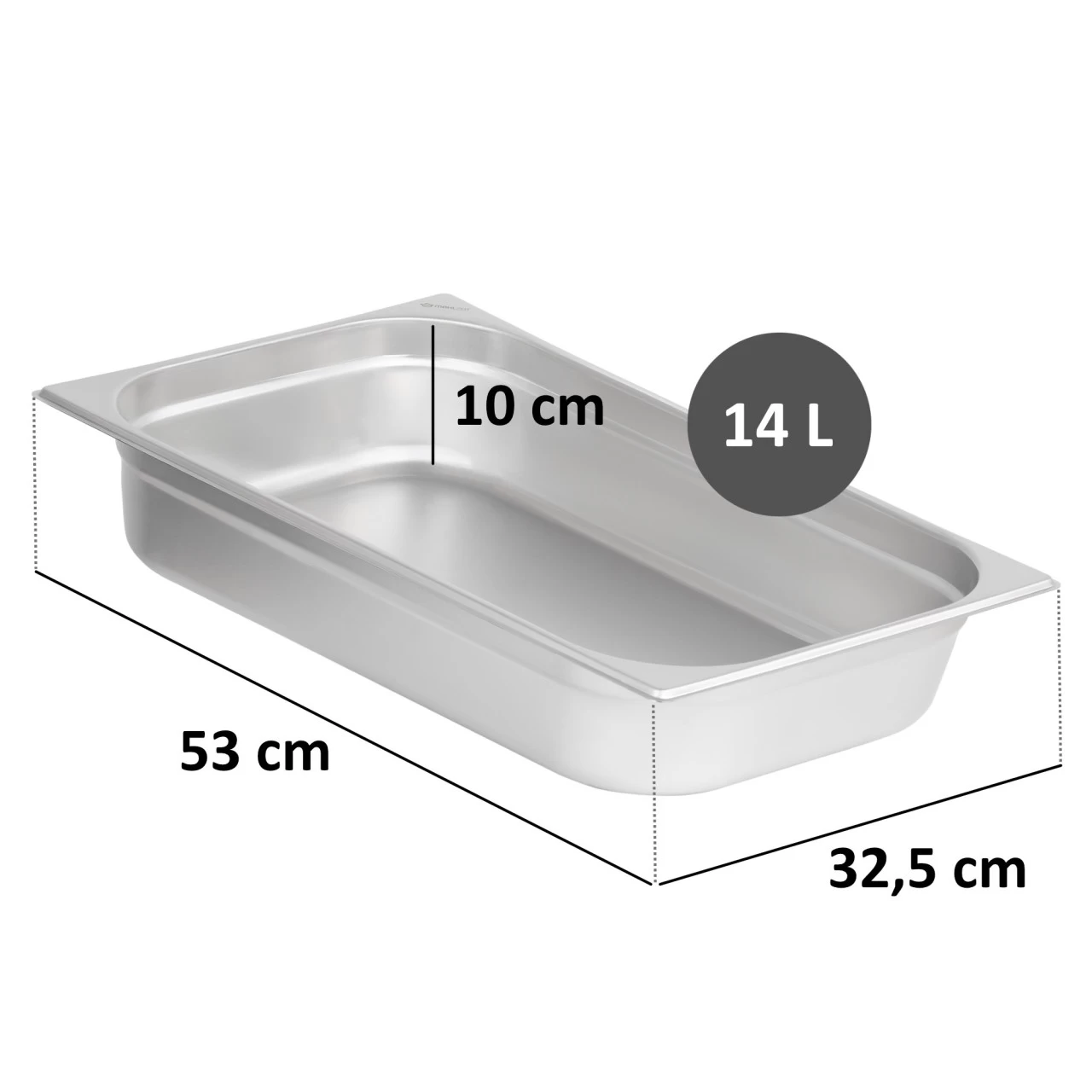 Der Gastronomie-Behälter besitzt ein Außenmaß von (B) 53 x (T) 32,5 x (H) 10 cm und ein Innenmaß von (B) 50,5 x (T) 30 x (H) 10 cm. Das Fassungsvermögen des Einsatzes beträgt 14 Liter.