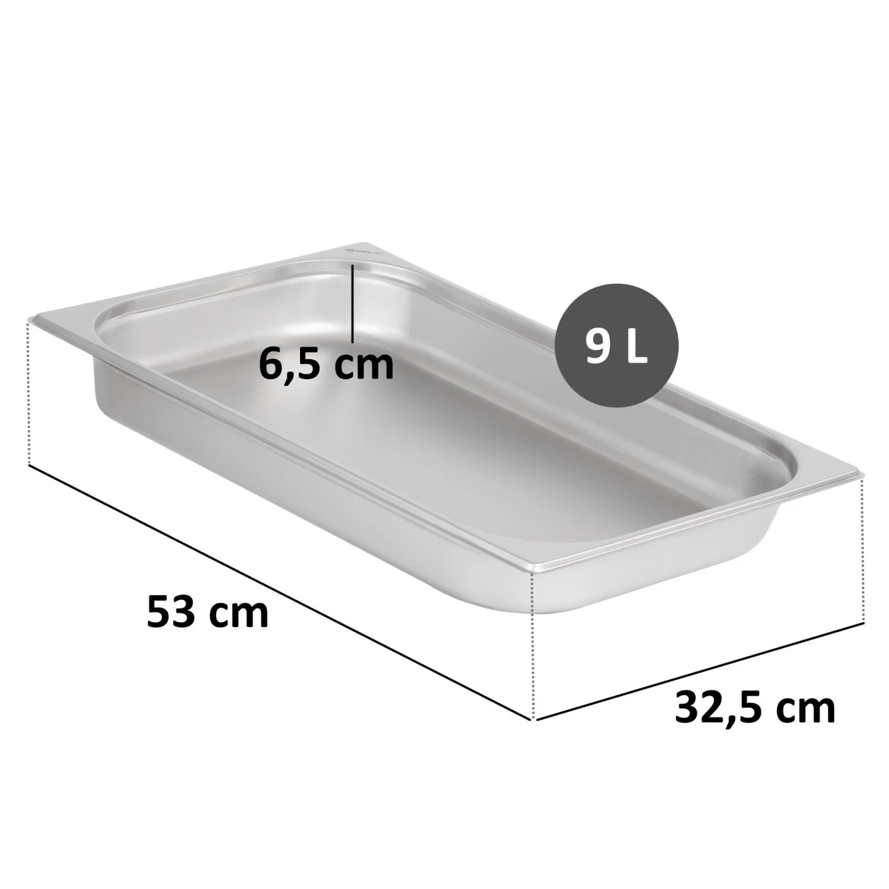 Der Gastronomie-Behälter mit Deckel besitzt ein Außenmaß von (B) 53 x (T) 32,5 x (H) 6,5 cm und ein Innenmaß von (B) 50,5 x (T) 30 x (H) 6,5 cm. Das Fassungsvermögen des Einsatzes beträgt 9 Liter.