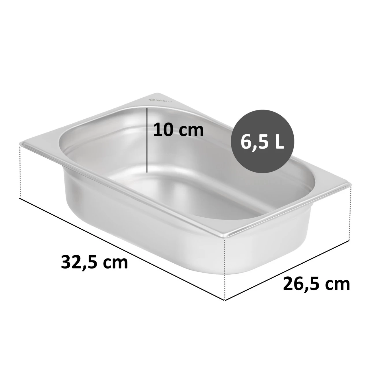 Der Gastronomie-Behälter besitzt ein Außenmaß von (B) 32,5 x (T) 26,5 x (H) 10 cm und ein Innenmaß von (B) 30 x (T) 24 x (H) 10 cm. Das Fassungsvermögen des Einsatzes beträgt 6,5 Liter.