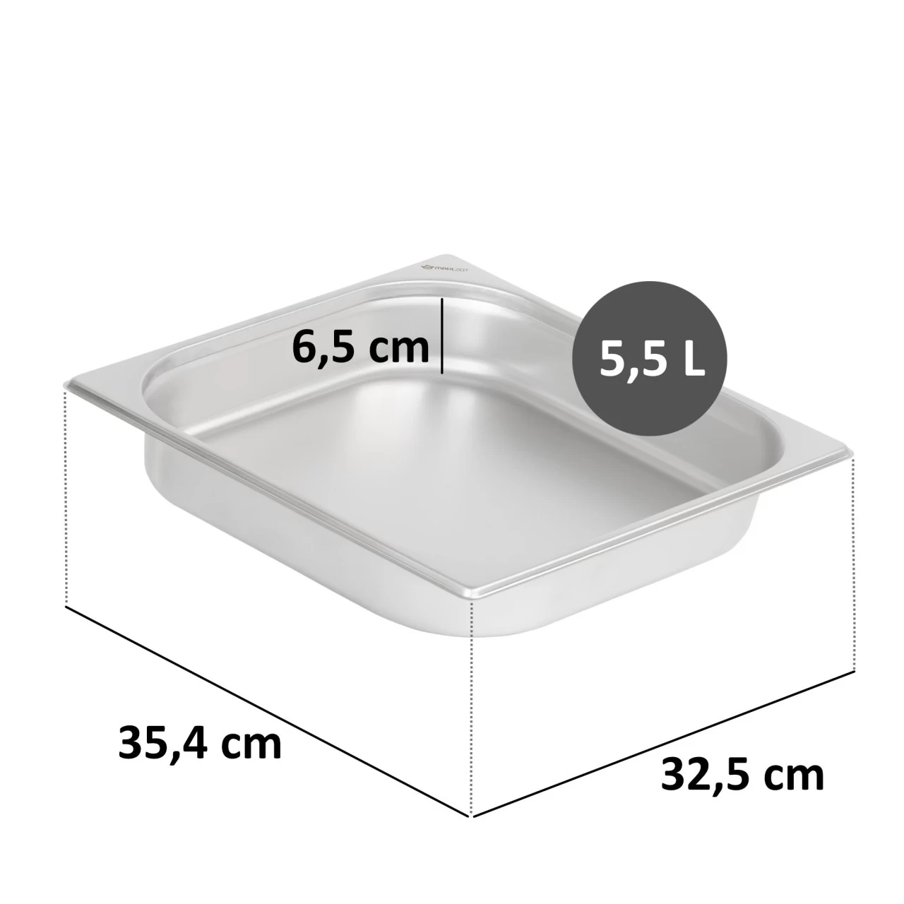 Der Gastronomie-Behälter besitzt ein Außenmaß von (B) 35,4 x (T) 32,5 x (H) 6,5 cm und ein Innenmaß von (B) 32,9 x (T) 30 x (H) 6,5 cm. Das Fassungsvermögen des Einsatzes beträgt 5,5 Liter.