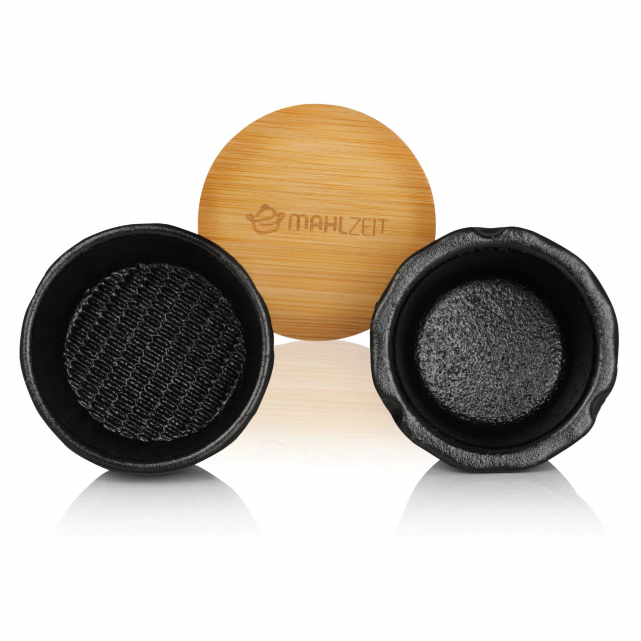Die Rillen an den Mühlenteilen sehen ansprechend aus und sorgen für einen sicheren Griff beim Zerreiben. Der edle Bambusdeckel wertet die Gusseisenmühle optisch auf und versichert dank der Silikondichtung eine licht- und aromageschützte Aufbewahrung des Inhalts. Der handliche Mörser hat eine Gesamthöhe von 8 cm und einen Durchmesser von 7,5 cm. Die Mühle ist platzsparend zusammenstapelbar und damit gut in der Küche verstaubar. Die Gewürzmühle ist aus robustem Gusseisen gefertigt – für eine lange Lebensdauer.