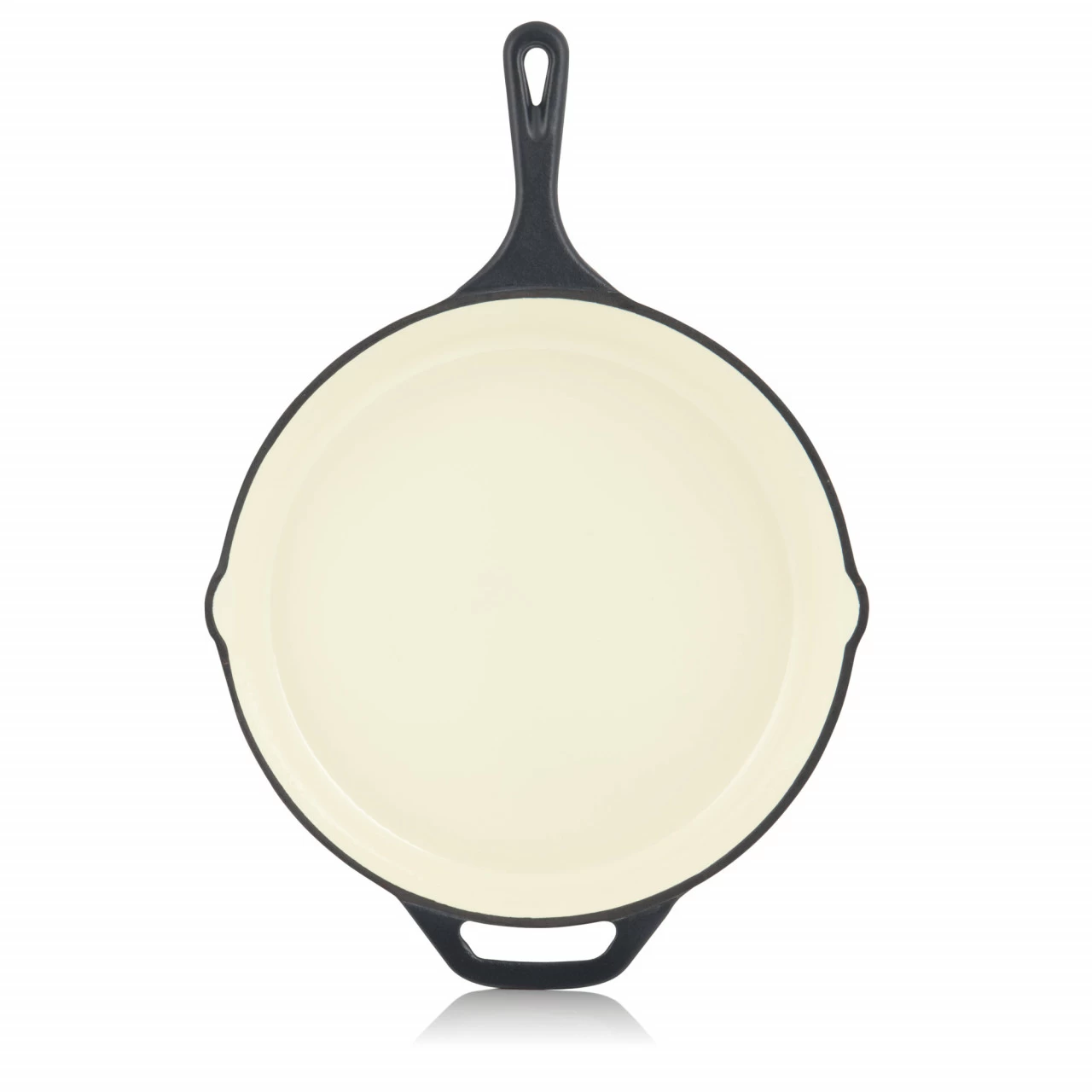 Die Pfanne mit hohem Rand besitzt einen langen Stiel und zwei seitliche Ausgießer, welche ein einfaches Portionieren und Ausschenken ohne Verkleckern ermöglichen. Die Gusspfanne ist thermoresistent und deshalb bestens geeignet für Kühlschrank, Backofen, Herd und Grill.