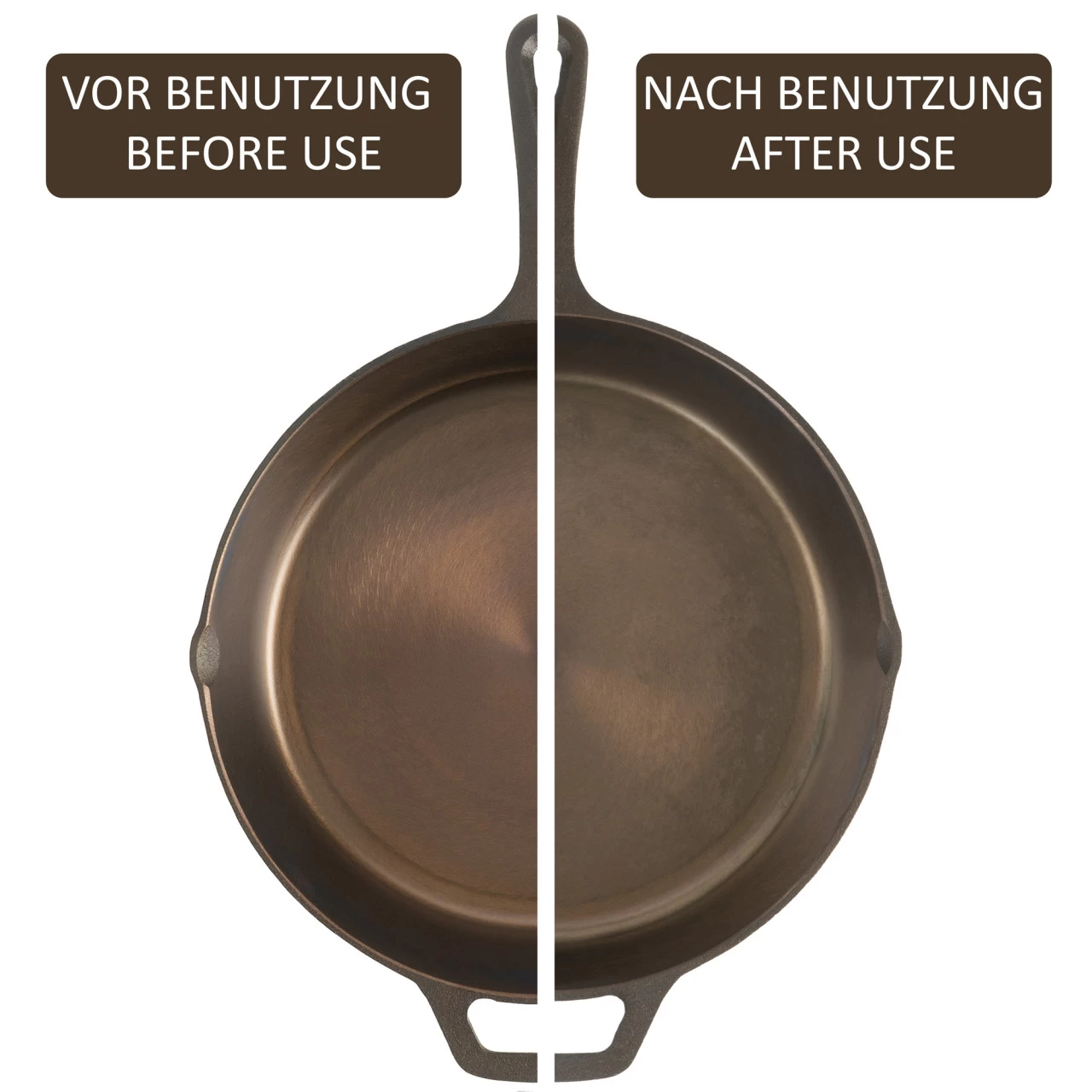 Brennen Sie die Pfanne vor der ersten Verwendung erneut ein, um die Polierung und die Antihaftwirkung beizubehalten. Verwenden Sie bei den ersten Nutzungen ausreichend pflanzliches Öl, um die Patina weiter zu stärken.