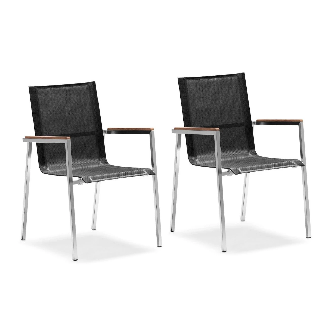 Die Gartenstühle haben ein hochwertiges, gebürstetes V2A Edelstahl Gestell und eine Nylongewebe Netzsitzfläche. Die Armlehnen sind aus Teak Holz.