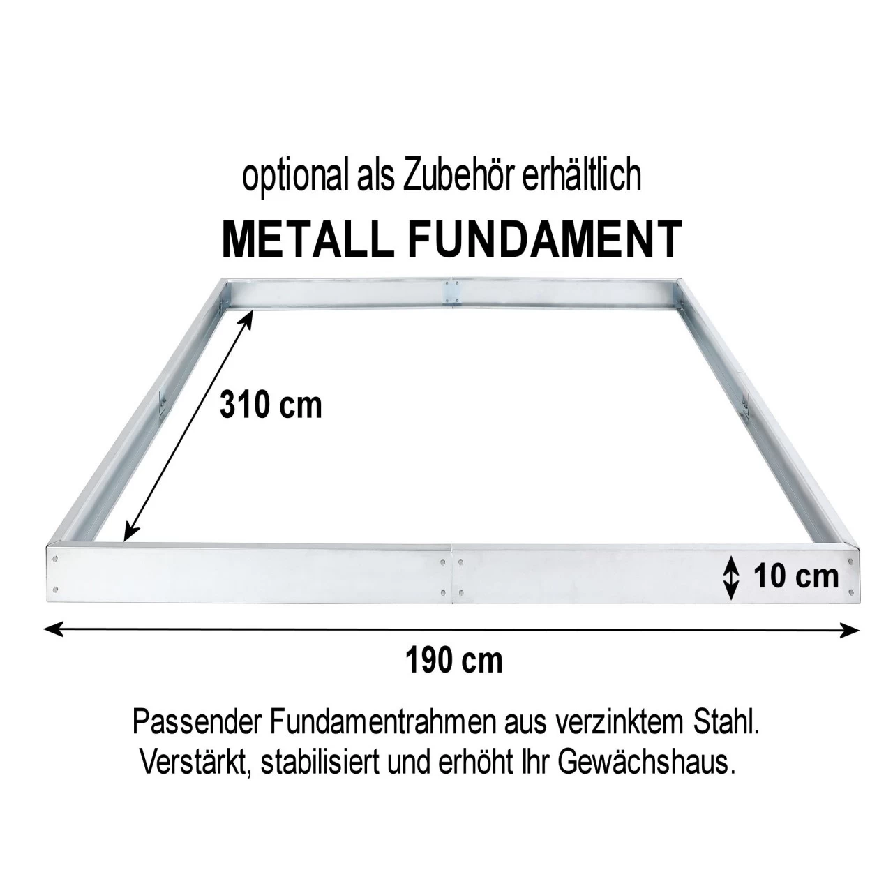 Fundamentrahmen aus verzinktem Stahl. Verstärkt, stabilisiert und erhöht Ihr Gewächshaus.