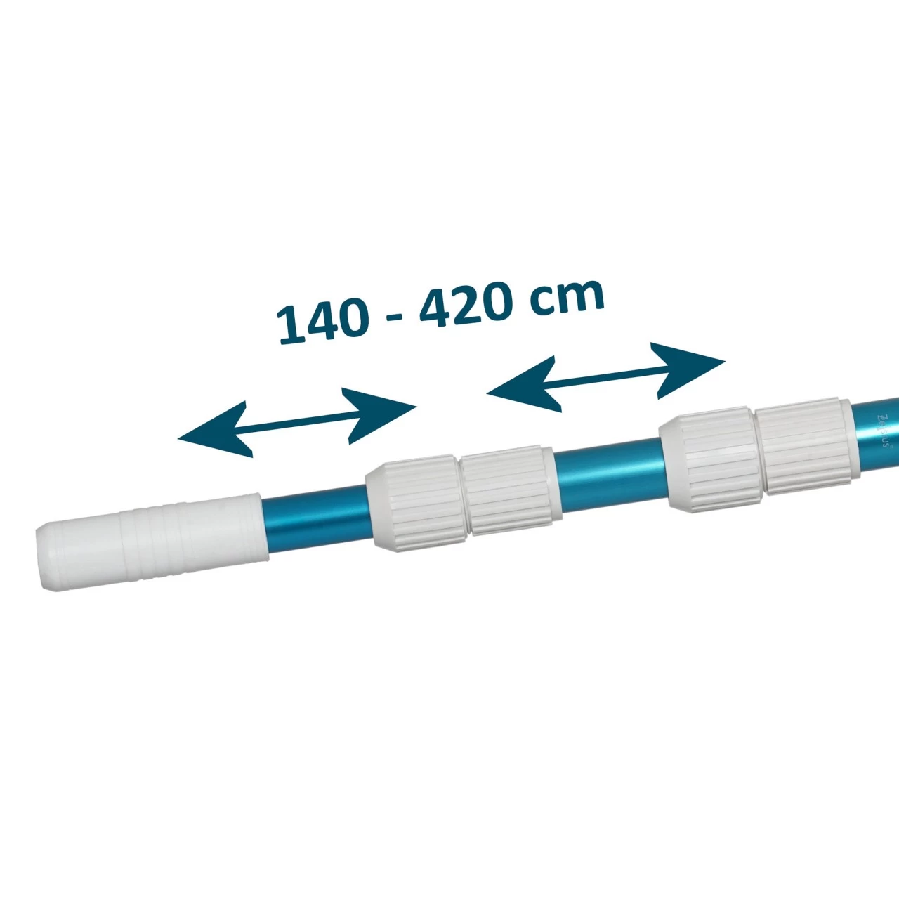 Die Teleskopstange kann stufenlos von 1,40 – 4,20 m ausgezogen werden und Sie erreichen bequem jeden Winkel in Ihrem Pool oder Teich. Mit Hilfe der Kunststoffdrehverbinders ist schnell die gewünschte Länge eingestellt.