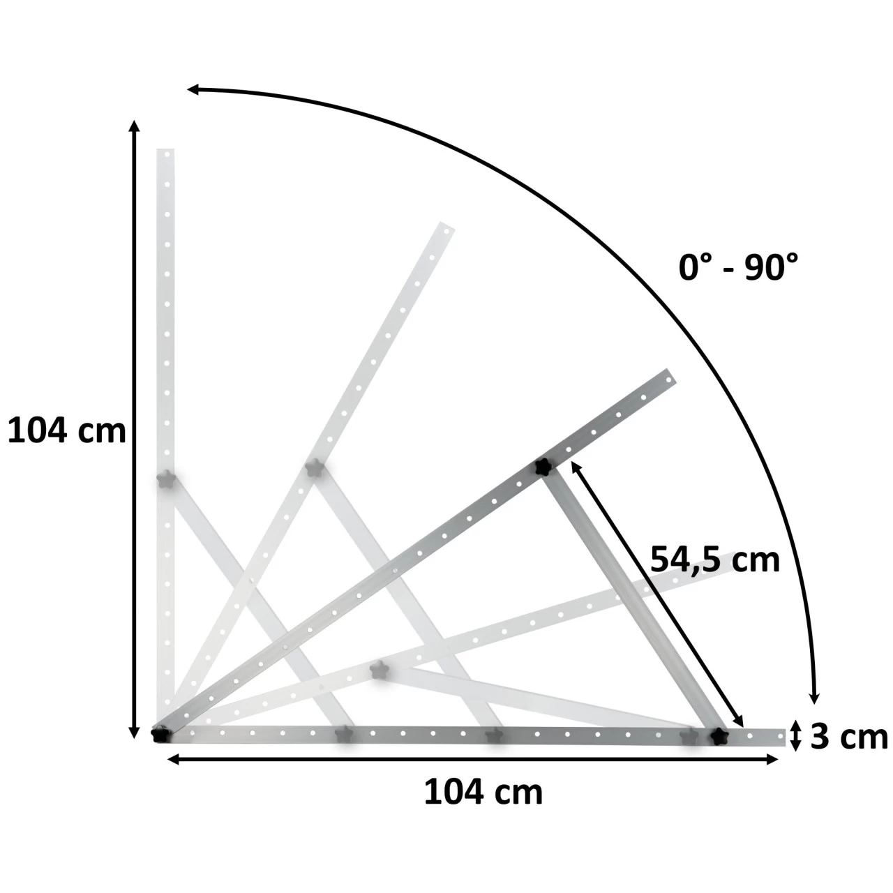 Solarmodule lassen sich mithilfe der Neigungshalterung nach Belieben vertikal oder horizontal montieren. Durch die anpassbaren Beine, die von 0 bis 90° Grad verstellt werden können, lässt sich die Neigung des Panels beliebig variieren. Die Halterung ist auch nach fertiger Montage einfach zu verstellen, einfach die Schrauben mit Drehknöpfen lösen und in die gewünschte Neigung einstellen.