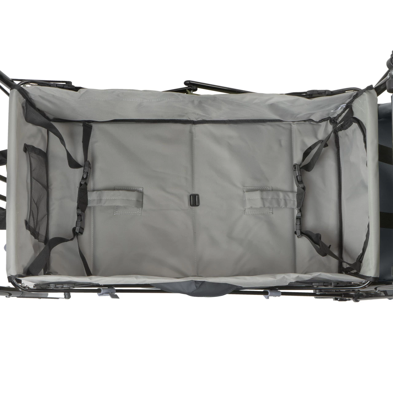 Dank seiner praktischen Konstruktion lässt sich der geräumige Bollerwagen mit nur wenigen Handgriffen mühelos zusammenfalten und platzsparend verstauen. Der Wagen ist auf der Ladefläche bis zu 90 kg belastbar und eignet sich daher auch ideal für den Transport schwerer Dinge. Um die Transportfläche zu erweitern, öffnen Sie einfach den Reißverschluss zur unteren Hecktasche.
