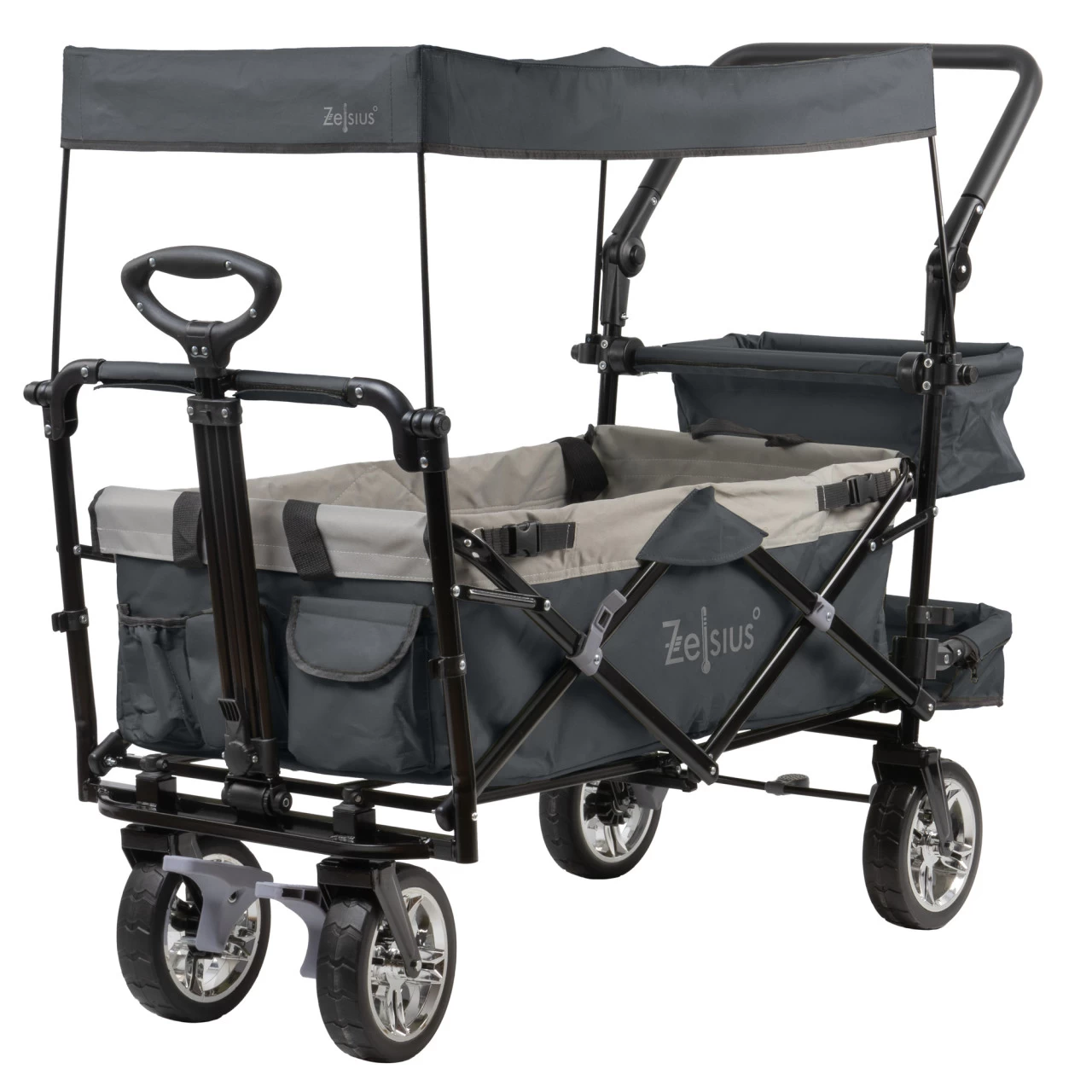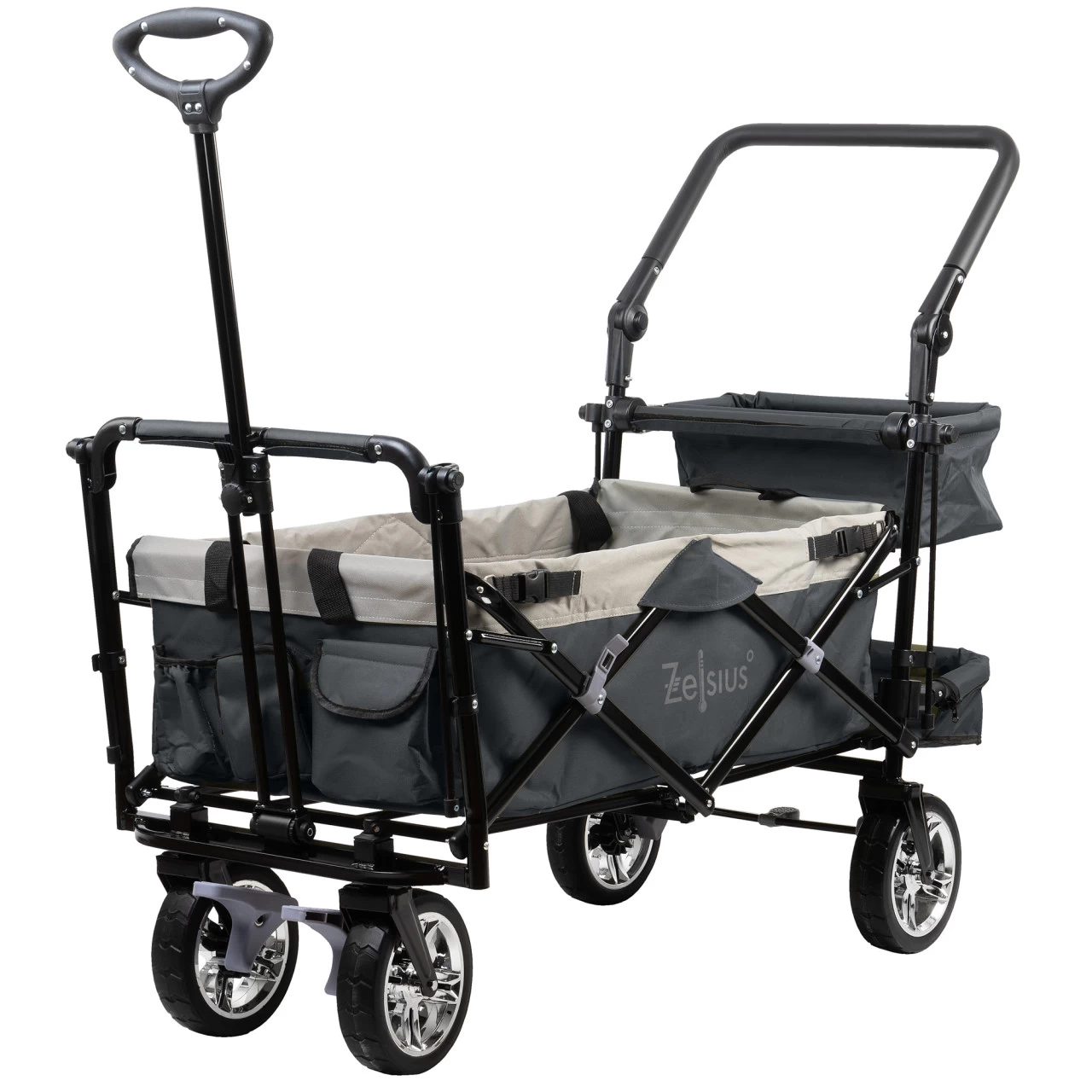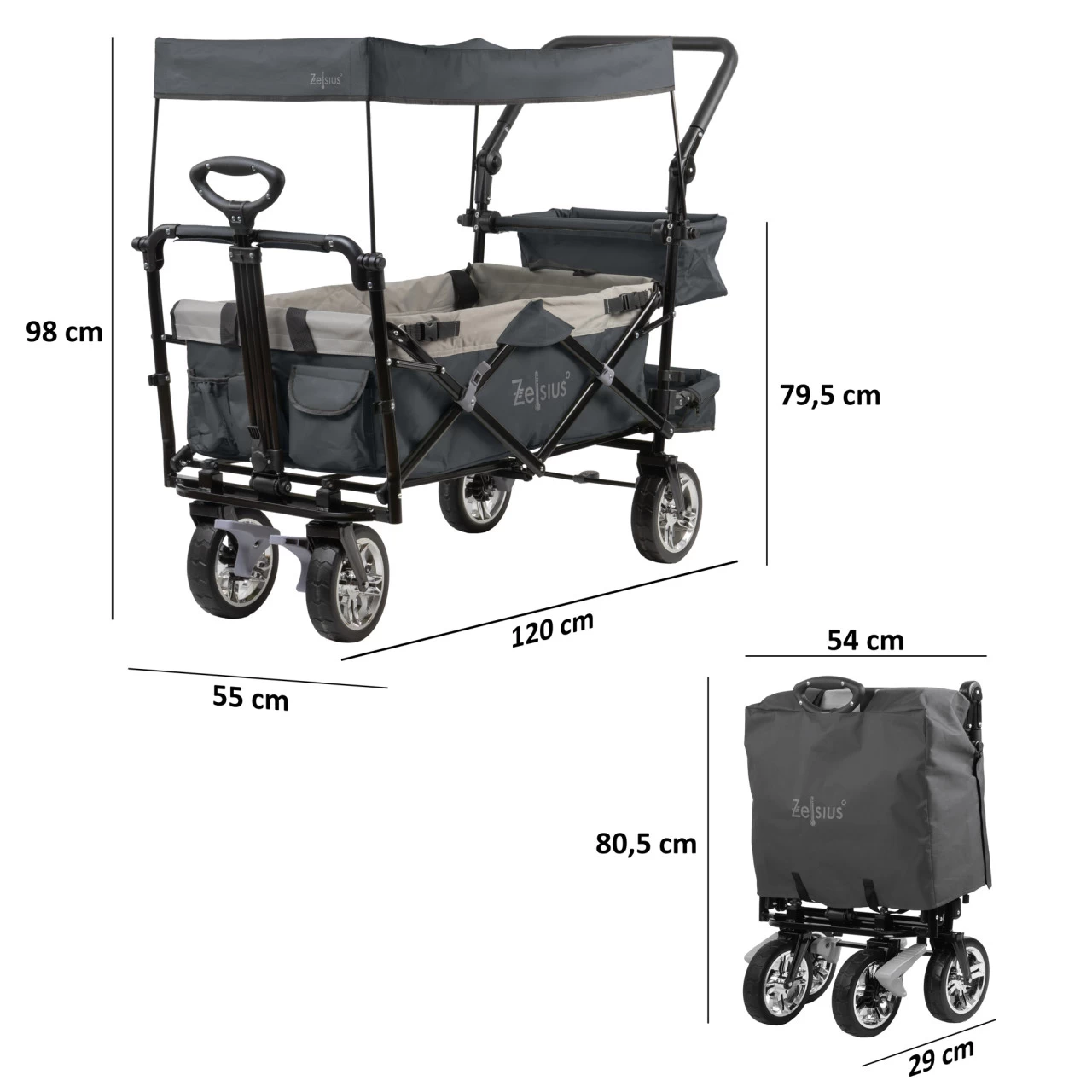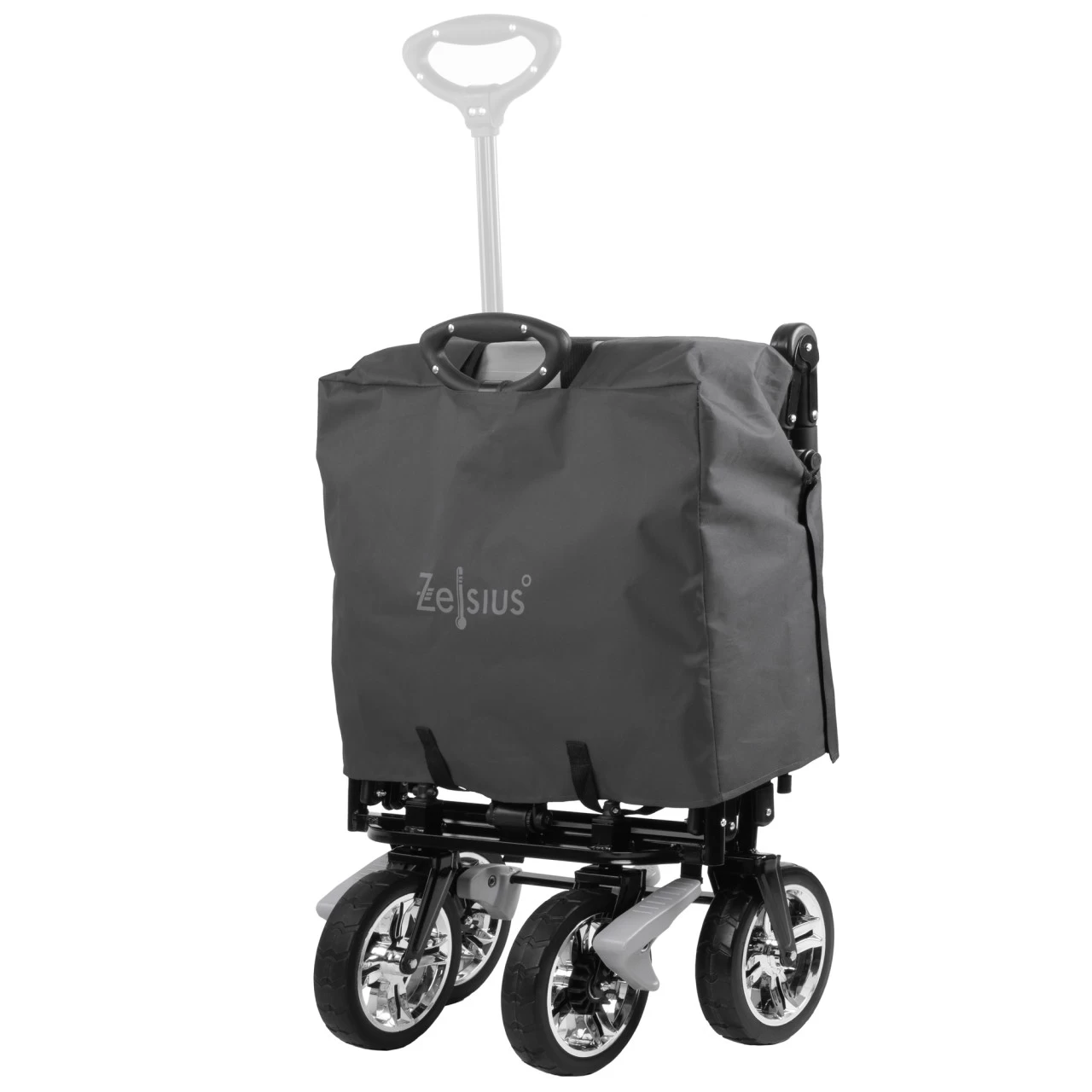 Der Zelsius Bollerwagen mit Dach ist der perfekte Begleiter für jeden Ausflug, egal ob beim Camping, zum Einkaufen, beim Wandern oder bei anderen Outdoor-Abenteuern. Mit einem großzügigen Fassungsvermögen von etwa 87,5 Litern garantiert er viel Platz und hohen Komfort.