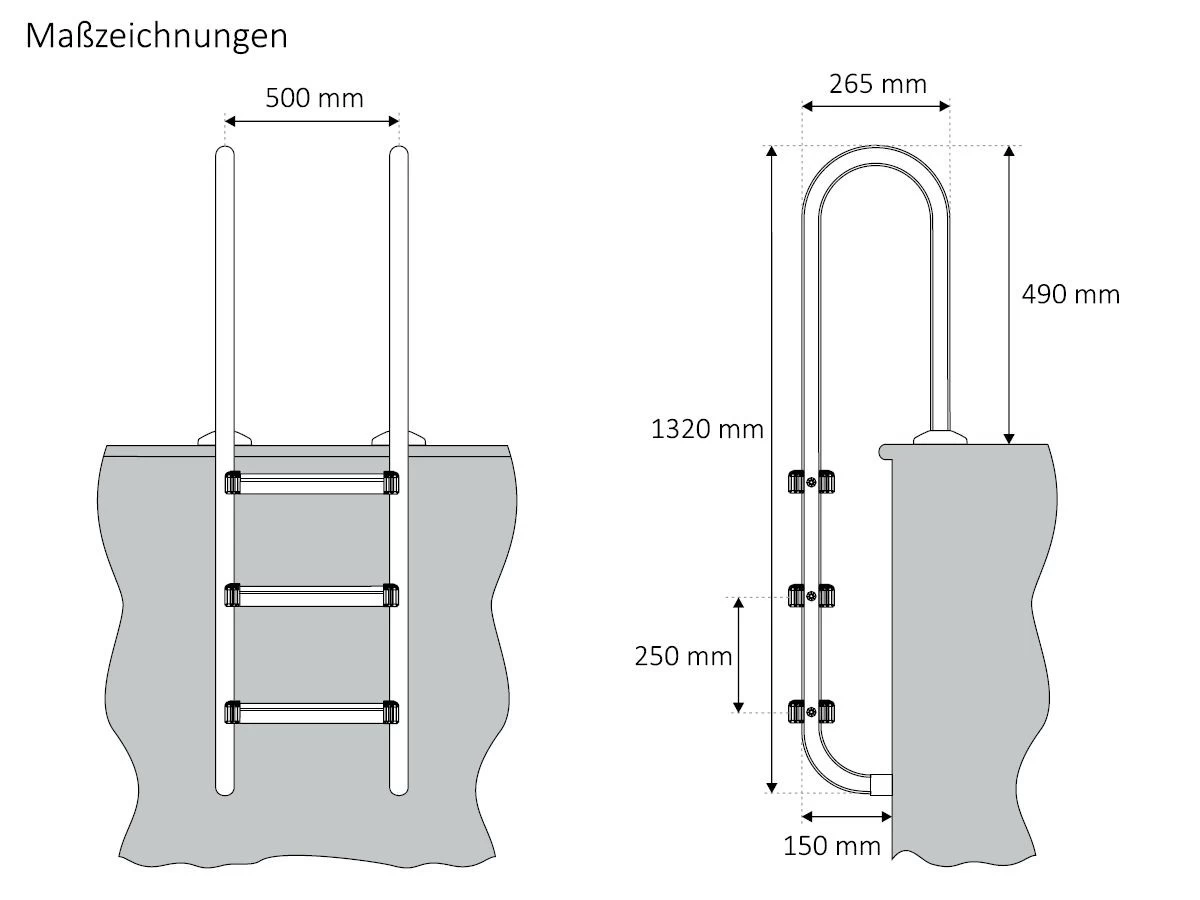 Der Lieferumfang umfasst die Poolleiter, zwei Befestigungshülsen zur Montage auf Beton oder anderen Oberflächen und einer Aufbauanleitung. Der Aufbau ist somit kinderleicht und in kurzer Zeit erledigt.