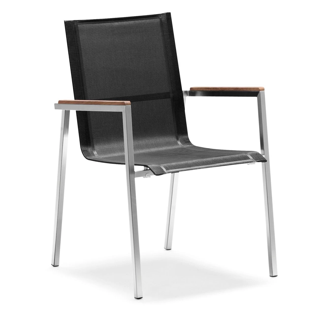 Der Gartenstuhl hat ein hochwertiges, gebürstetes V2A Edelstahl Gestell und eine Nylongewebe Netzsitzfläche. Die Armlehnen sind aus Teak Holz.